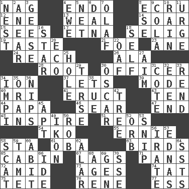 ACROSS 1. Tired old horse 4. Inside; within (prefix) 8. Shade of tan 12. Compass dir. 13. Welt 14. Fly high 15. Observes 17. Inactive volcano in Sicily 18. Former Milwaukee Brewers owner Bud 19. Clothes sense 21. Enemy 23. A saturated hydrocarbon 24. Arrive at 26. Chicken ___ king 28. Carrot, for example 30. Person of authority 34. Electrically charged atom 37. Allows 39. Method 40. Medical imaging device (abbr.) 41. Spew [out] 43. Nine, plus one 44. Dad 46. Scorch 47. Conclude 48. Heighten or intensify 51. Vintage cars 54. Ring climax 55. Bert's buddy 58. R.R. building 61. Chief or king in Benin or Nigeria 63. Avian creatures 65. Small house or cottage 67. Fails to keep up a pace 71. Baking dishes 72. Among 73. Matures 74. Make lace 75. Wig 76. French philosopher Descartes 77. Curvy letter DOWN 1. A home for chicks 2. Approach 3. Honkers 4. She-sheep 5. Fish or hair follower 6. One of the 12 tribes of Israel 7. Norwegian king 8. Compass dir. 9. Root beer relative 10. Water falling in drops from the sky 11. Goad 16. Play the lead 18. Oneself 20. Environmental prefix 22. Clumsy lout 25. Opening into or through something 27. Direct toward a target or goal 29. Laconic 30. Motion picture award 31. ____ d'Azur (French Riviera) 32. Paradise 33. Tear apart 34. Body of Kaffir warriors 35. Northwest Algerian city 36. Pinches, bites 38. Third day of the wk. 42. Relationship diagram 45. Fitting 49. Picture 50. Director Reiner 52. Globe 53. Sever or remove by pinching or nipping 56. Feeling or showing extreme anger 57. Ferber et al. 58. Leave at once 59. Not wild 60. "This won't hurt ____!" 62. Having or resembling wings 64. Fast planes 66. Binary compound 68. Ripen 69. Commissioned mil. rank 70. Compass dir.