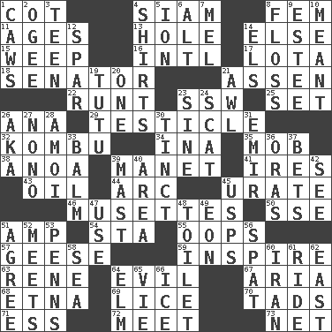 ACROSS 1. Small bed 4. Thailand, formerly 8. Opposite of masc. 11. Matures 13. Opening into or through something 14. Otherwise 15. Shed a tear 16. International (abbr.) 17. Globular water bottle used in Asia 18. Legislator 21. NE Netherlands city 22. The smallest animal of a litter 23. Compass dir. 25. Put into a specified state 26. Santa ___, CA 29. A testis 32. Dried seaweed eaten as food 34. _ tizzy (2 wds.) 35. Crowd into 38. Small Philippine buffalo 39. French painter Edouard 41. Angers 43. Petroleum 44. Curve 45. A salt of uric acid 46. French bagpipes 50. Compass dir. 51. Electrical Unit 54. R.R. building 55. I made a mistake 57. Honkers 59. Heighten or intensify 63. French philosopher Descartes 64. Morally bad or wrong 67. Operatic vocal solo 68. Inactive volcano in Sicily 69. Louse (plural) 70. Small boys 71. Double-curved letter 72. Confront 73. Remaining after all deductions DOWN 1. Crow sounds 2. Double curve, resembling the letter S 3. Adolescent 4. Chest coverings 5. Electrically charged atom 6. Keyboard modifier key 7. Cartoonist voice _ Blanc 8. Soft thread for cleaning between teeth 9. First name in cosmetics 10. Intended 12. Practice fight 14. Raised railways 19. Ballerina skirt 20. Single 21. Leather borer 23. Trig term 24. Go away! 26. Alias (abbr.) 27. Words to Nanette 28. Mine, in Marseilles 30. Tinged 31. Arab leader 33. Lip ointment 36. Mouths or openings 37. Wagers 39. Vertical spar for supporting sails 40. Type of rug 42. Perceive with the eye 45. United States Postal Service (abbr.) 47. Purpose 48. Bathroom 49. Period of immesurable duration 51. Match 52. Confronts 53. Actor Sean's family 56. Argument over a trivial matter 58. Ocean 60. SW Asia republic 61. Travel on an animal 62. 90 degrees 64. Shade tree 65. Compete 66. Frozen water