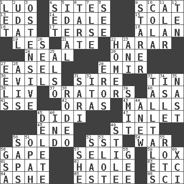 ACROSS 1. Nilotic language 4. Locates 9. Go away! 13. Begley and Asner 14. Peak District village in England 15. Lacquered or enameled metalware 16. Make lace 17. Laconic 18. Actor Alda or Thicke 19. French article 21. Had dinner 22. Ethiopian city, capital of Harari 24. Actress Patricia 26. Single 27. Artist's stand 29. Arab leader 30. Vices 31. Title for a man of rank and authority 33. Metal container 36. 54 in ancient Rome 37. Speakers 40. White ___ sheet 41. Compass dir. 42. Mouths or openings 43. Shopping centers 45. "You Light Up My Life" star Conn 47. An arm off of a larger body of water 48. Compass dir. 49. Proofreading order 50. Twentieth part of a lira 52. Fast jet (abbr.) 54. Armed conflict 56. Yawn 57. Former Milwaukee Brewers owner Bud 59. Brine-cured salmon 61. Argument over a trivial matter 62. White Person, in Hawaii 63. And so on (abbr.) 64. American tennis player Robert 65. First name in cosmetics 66. _-fi DOWN 1. Allow 2. Freehold land 3. Clearly or manifestly demonstrative 4. Put into a specified state 5. Standard of perfection 6. Small pie 7. Otherwise 8. Observe 9. A viewer who gazes fixedly 10. Root beer relative 11. Having or resembling wings 12. Nine, plus one 20. Sew up the eyelids of hawks and falcons 22. Home run 23. Cuckoo 25. In addition 27. Snakelike fish 28. Deliberation 29. Greek god of love 31. Indian skirt 32. Call ___ day 33. Baron Munchausen's specialties 34. Small island 35. Political cartoonist Thomas 38. Cowboy competition 39. Stricken, poetically 44. Afresh 45. Keyboard key 46. Working for oneself (abbr.) 49. Vertical member of a panel or frame 50. Plant excrements 51. Brightly colored fish 52. Oceans 53. Narrow opening 55. College mil. group 56. Girls' org. (abbr.) 57. A female animal or person 58. Unit of force equal to gravity 60. One more than ninety