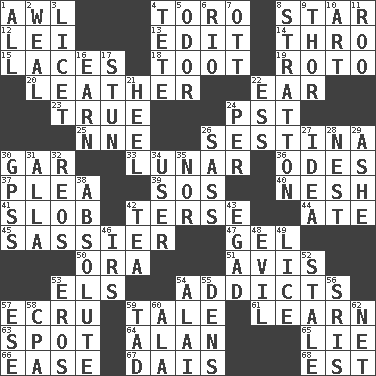 ACROSS 1. Leather borer 4. "Corrida" creature 8. Play the lead 12. Flowery wreath 13. Prepare for publication 14. Through, poetically 15. Shoestrings 18. A blast of a horn 19. Printing process, for short 20. Cordwainer's material 22. Ewer handle 23. Loyal 24. Pacific Standard Time (abbr.) 25. Compass dir. 26. French poetic form 30. Slender fish 33. Type of eclipse 36. Lyric poems 37. Entreaty 39. Mayday 40. Tender 41. Messy guy 42. Laconic 44. Had dinner 45. More disrespectful 47. Set 50. Mouth or opening 51. Deliberation 53. Raised railways 54. Inveterate users 57. Shade of tan 59. Falsehood 61. Memorize 63. Specific locale 64. Actor Alda or Thicke 65. Falsehood 66. Comfort 67. Raised platform 68. Eastern Standard Time (abbr.) DOWN 1. 100% 2. Welt 3. It is permitted: Lat. 4. Wig 5. Scent 6. _ de Janeiro 7. Baseball player Mel 8. Ski resort town in Vermont 9. Son of Odin 10. Tate display 11. Friend of Pooh 16. Merit 17. Astound 21. Person who is morally reprehensible 22. Double-curved letter 24. For each 26. Backtalk 27. The main thing one is thinking about 28. A home for chicks 29. American tennis player Robert 30. Global Positioning Systems (abbr.) 31. Silent film actress Nazimova 32. Vintage cars 34. One who uses or employs something 35. Not either 38. Utter; complete 42. Beverage made from leaves 43. Mild oath 46. Big collection agency 48. Morally bad or wrong 49. Louse (plural) 52. Lacking originality or spontaneity 53. Greek god of love 54. Mountain range southwest of Kyrgyzstan 55. Lairs 56. Indian titles of respect 57. Compass dir. 58. Accounting whiz (abbr.) 59. Bit 60. In the manner of 62. Remaining after all deductions