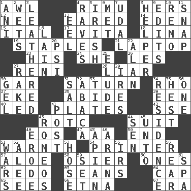 ACROSS 1. Leather borer 4. Tall New Zealand timber tree 8. Possessive pronoun 12. Born 13. Having ears or earlike features 14. Genesis locale 15. Slanted text style (abbr.) 17. Webber/Rice musical 18. Pale green bean 19. Paper fasteners 21. Portable computer 23. Part of HMS, perhaps 24. A female animal or person 26. French article 27. Painter Guido (1575-1642) 28. One who doesn't tell the truth 30. Slender fish 31. Titan orbits this 34. 17th letter of the Greek alphabet 37. Make supply last 38. Stay 39. Car or cant ending 40. Directed 41. Food holders 42. Compass dir. 43. College mil. group 44. Set or collection 46. Greek goddess of the dawn 47. American Automobile Association (abbr.) 50. Conclusion 51. Heat 54. Hard copy producer 57. _ vera 58. Flexible twig of a willow tree 60. Washington bills 62. Make new 63. Seines 64. Head covering 65. Observes 66. Inactive volcano in Sicily 67. Epoch DOWN 1. Black tropical American cuckoo 2. Soaks 3. Resembling or made to resemble leather 4. All-night dance parties 5. From or relating to Ireland 6. Was introduced to 7. Allodial 8. Assistant 9. Proofreads 10. San ____ (Riviera town) 11. Fastener 13. Snakelike fish 16. (Had) reclined 20. 23rd letter of the Greek alphabet 22. Actor Alda or Thicke 25. Dodge 27. Libertine 29. Angers 30. Set 31. Table seasoning 32. Phillipine bananalike plant 33. Teat (slang) 34. Dwelling 35. Behest 36. Single 41. Mail 43. Lover boys 44. Elected rep. 45. To (old English) 46. Wear away 48. Bee-related 49. Sports stadium 51. Armed conflicts 52. Toward shelter 53. Stockings 55. Big collection agency 56. Stern 59. Put into a specified state 61. Health resort