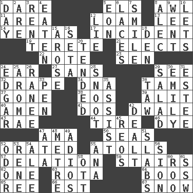 ACROSS 1. Have the gumption 5. Raised railways 8. Leather borer 11. Type of rug 12. Rich soil 13. Area sheltered from the wind 14. Gossips 17. Happening 19. Cigar-shaped 21. Chooses 22. Short letter 23. Elected rep. 24. Hearing organ 27. Without 29. Perceive with the eye 32. Window treatment 34. Heredity factor (abbr.) 36. Scottish caps 37. Went 38. Greek goddess of the dawn 39. Came down and settled, as after flight 40. So be it 41. Two (Sp.) 42. A sleeping potion; an opiate (poet.) 43. Actress Charlotte 44. Hoop that covers a wheel 46. Color 47. Wet nurse (var.) 50. Oceans 52. Declaimed 55. Ringlike coral islands and reefs 57. Accusation by an informer 59. Flight of steps 62. Single 63. Round or rotation of duties 64. Expressions of contempt or scorn 65. To separate or throw off 66. Eastern Standard Time (abbr.) 67. Overwhelm DOWN 1. 24 hours 2. "We ___ not amused" (Victoria) 3. Monthly bill 4. Eroded 5. A really long time 6. Shoestrings 7. Grin 8. Actor Baldwin 9. Left 10. Allows 12. Untruth 15. Came up 16. Stalk of a moss capsule 18. Lair 20. Watched over 24. _ Allan Poe 25. Odor 26. Indian princess (variant) 28. Snob 29. Vegetable dish 30. Poet Dickinson 31. First name in cosmetics 33. Writing instrument 35. Aid 36. The 23rd letter of the Hebrew alphabet 42. Started a card game 45. Vintage cars 47. _ moment's notice (2 wds.) 48. Distance measurement (Brit.) 49. Goodbye (Sp.) 51. Thick slices 52. Aroma 53. French philosopher Descartes 54. Toward shelter 55. Santa ___, CA 56. The Jewish people; Israel 58. Baseball player Mel 60. Friend of Pooh 61. Compass dir.