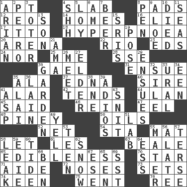 ACROSS 1. Fitting 4. Broad, flat, thick piece 8. Groovy apts. 12. Vintage cars 14. Residences 16. Writer Wiesel 17. "Tell ____ the Marines!" 18. Abnormally rapid or deep breathing 20. Sports stadium 22. River (Sp.) 23. Begley and Asner 24. Not either 25. Madame (abbr.) 28. Compass dir. 30. Highlander 31. Take place subsequently 35. According to 37. Pulitzer Prize-winning author Ferber 40. Male parent of an animal 41. Having or resembling wings 42. Looks after 44. Uhlan (variant) 45. Stated 46. It's straight from the horse's mouth 47. Snakelike fish 48. Abounding in pines 50. Lubricates 52. Fish or hair follower 54. R.R. building 55. Floor protector 58. Allow 61. French article 63. Calif. Air Force Base 65. The property of being fit to eat 70. Play the lead 71. Assistant 72. Olfactory organs 73. Puts into a specified state 74. Peachy ____! 75. Left 76. To sift DOWN 1. Believer in; advocate of (suffix) 2. Stone: prefix 3. Carrier 4. Quiet! 5. Myrna of the movies 6. Electrical Unit 7. Fermented drink made from hops 8. Fenced enclosure 9. _ vera 10. Passed on 11. Oceans 13. Male child 15. Indian titles of respect 19. Introduce or present, as a question 21. Wet nurse (var.) 26. Confront 27. A person who is older than you are 29. Takes place subsequently 30. Place where plants grow 32. Drop; flow; fall 33. Mountain range 34. Car or cant ending 35. Jai ____ 36. (Had) reclined 38. Compass dir. 39. Goodbye (Sp.) 41. Cleo's killer 43. In a ____ (agitated or irritated) 49. Shout 51. Experiment locale 53. Adolescent 55. Mother 56. Having winglike extensions 57. Laconic 58. Path through which fluid escapes 59. Singer Brickell 60. Periodic rise and fall of the sea level 62. Overwhelm 64. Double-curved letter 66. Benjamin's nick name 67. Compass dir. 68. Elected rep. 69. Fast jet (abbr.)