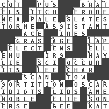 ACROSS 1. Small bed 4. Product of festering 7. Naughty child 11. Raised railways 12. Hankering 13. Eat (away) 14. Teachers' org. 15. Diluted with white 16. Chalkboards 17. Singer Mel 19. Helper 21. Adept person 23. Angers 24. Pate de foie ____ 25. Ripen 26. Infant locale 29. Voters do this 30. Followers of ems 31. Pipe bend 32. Australian flightless bird 33. Big collection agency 34. Can I? 35. Untruth 36. _-fi 37. Happen 40. ___ a Wonderful Life 41. Area sheltered from the wind 42. Burn to charcoal 43. Glance over 45. Pull behind 46. Determination 51. Witty Wilde 55. Foolish or stupid persons 56. Hats (slang) 58. A saturated hydrocarbon 59. Having high moral qualities 60. Writer Wiesel 61. Manchild 62. Celtic language 63. Unit of force equal to gravity 64. Krazy ___ of comics DOWN 1. Penny 2. Margarine 3. Russian ruler of old 4. Parent Teacher Assoc. 5. Southern CA. univ. 6. "______ My Girl" (Turtles hit) 7. Naughty children 8. Roll call or roster of names 9. Arabian gulf 10. Trial 12. Medicinal drug used to evoke vomiting 13. Otherwise 16. Titles for men of rank and authority 18. Female horse 20. Signals 22. Eastern Standard Time (abbr.) 24. Adhesives 25. Nest on high 26. Arboreal primate 27. Having or resembling wings 28. Strand of rope, yarn or thread 29. Give off 32. Biblical high priest 33. Ancient Celtic tribe of eastern Britain 36. Narrow boards 37. Sep. follower 38. Elect 39. Crow sounds 43. Fur scarf 44. Quote 46. Trig term 47. Scent 48. Teases 49. Cassini of fashion 50. Mediterranean tributary 52. Keg 53. Small Philippine buffalo 54. Monthly bill 57. Expire