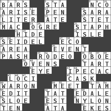 ACROSS 1. Long, evenly shaped pieces 5. R.R. building 8. Non-commissioned officer (abbr.) 11. Ascend 13. Animal enclosure 14. "Two Mules for Sister ____" 15. 61 cubic inches 16. Had dinner 17. Proofreading order 18. Apple computer (short form) 19. Legendary monster 21. Staphylococcus 22. Flintstone garb 24. Capri or Wight 25. A glass for beer 27. Environmental prefix 29. Length times width 30. Incident 32. Romantic infatuation 33. Cowboy competition 35. Mitch Miller's instrument 39. Baking chambers 41. Small pie 42. Sight organ 43. Medicinal drug used to evoke vomiting 45. Venues 48. Keg 49. Make _____ (do battle with) 50. Confront 52. Scottish cap 55. Prepare for publication 56. Make lace 57. Peak District village in England 59. _ gin 60. Eastern Standard Time (abbr.) 61. Thermoplastic polyamide 62. Nine, plus one 63. _ moment's notice (2 wds.) 64. Makes supply last DOWN 1. Lip ointment 2. Roberta Peters solo 3. Actors Guy, Robert Welles, and Clint 4. Compass dir. 5. Coast Guard woman 6. Wig 7. One (Scot) 8. Relating to or accompanying birth 9. Streamer paper 10. Pledge 12. Wear away 14. Fast planes 20. Set 21. The Jewish people; Israel 23. Potato state 25. Plant excrement 26. Epoch 27. First lady 28. Corporate head (abbr.) 30. Begley and Asner 31. Lugs 33. Marina Del _, California 34. Single 36. Sass 37. Mouth or opening 38. And so on (abbr.) 40. Distinctive style or manner 43. Frozen water 44. Eucharist need 45. Dipping utensil 46. Constellation of myth 47. ____ d'Azur (French Riviera) 49. 270 degrees 50. Vertical spar for supporting sails 51. Singer James 53. Medicinal plant 54. Not women's 56. Afternoon social gathering 58. Color