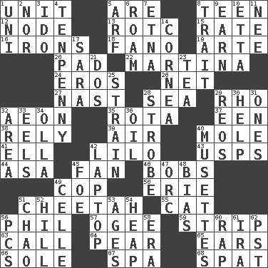ACROSS 1. A single undivided whole 5. "We ___ not amused" (Victoria) 8. Adolescent 12. Thickened enlargement 13. College mil. group 15. Pace 16. Removes the wrinkles 18. Papal veil 19. Johnson of "Laugh-In" 20. Groovy apt. 22. Chrissie's court nemesis 24. Greek god of love 26. Fish or hair follower 27. Political cartoonist Thomas 28. Ocean 29. 17th letter of the Greek alphabet 32. Period of immesurable duration 35. Round or rotation of duties 37. Car or cant ending 38. Depend 39. Wind 40. Undercover agent 41. Pipe bend 42. _ and Stitch 43. United States Postal Service (abbr.) 44. White ___ sheet 45. Air blower 46. Moves up and down 49. Police officer (slang) 50. One of the Great Lakes 51. Leopard's kin 55. Domesticated feline 56. Silvers or Donahue 57. Double curve, resembling the letter S 59. Long narrow piece of something 63. Give a ring to 64. Lightbulb-shaped fruit 65. Hearing organs 66. Flatfish 67. Health resort 68. Argument over a trivial matter DOWN 1. University (slang) 2. Not either 3. Wedding promise 4. 3-inch nail 5. Sandy's bark 6. Wander aimlessly 7. Inactive volcano in Sicily 8. Distinguishing feature 9. Merit 10. Singer James 11. Born 14. Pupil covering 17. "Two Mules for Sister ____" 21. Two (Sp.) 23. Afternoon social gathering 25. Put through a sieve 28. Disco prop 29. Vintage cars 30. Aid 31. Singles 32. Length times width 33. Snakelike fish 34. Spanish pot 36. Petroleum 40. French bagpipes 42. Portable computer 45. Enemy 47. The grampus (Milton) 48. Prejudice 49. Cell (Danish) 51. US Secretary of Labor Elaine L. _ 52. Land elevation 53. Ripens 54. Pile 56. Personal Computers (abbr.) 58. Epoch 60. Hit sharply and swiftly 61. Lyricist Gershwin 62. Pacific Standard Time (abbr.)
