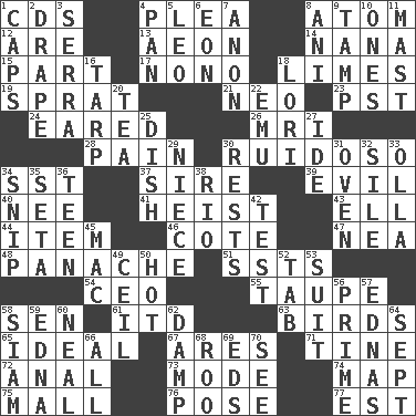 ACROSS 1. Music discs 4. Entreaty 8. Smallest unit of an element 12. "We ___ not amused" (Victoria) 13. Period of immesurable duration 14. Grandmother 15. Piece 17. Words to Nanette 18. Citrus fruits 19. Small fatty European fish 21. Modern: prefix 23. Pacific Standard Time (abbr.) 24. Having ears or earlike features 26. Medical imaging device (abbr.) 28. Ache 30. Noisy, rowdy, vocal (Spanish) 34. Fast jet (abbr.) 37. Father 39. Morally bad or wrong 40. Born 41. Robbery 43. Pipe bend 44. Detail 46. ____ d'Azur (French Riviera) 47. Teachers' org. 48. Flamboyance 51. Fast planes 54. Corporate head (abbr.) 55. Grayish beige 58. Elected rep. 61. It would 63. Avian creatures 65. Standard of perfection 67. Ancient Greek god of war 71. Prong on a fork 72. Of or related to the anus 73. Method 74. Atlas unit 75. Shopping center 76. Introduce or present, as a question 77. Eastern Standard Time (abbr.) DOWN 1. Smile enhancers 2. Window treatment 3. Spanish missionary in California 4. Baking dish 5. Lion 6. Period of immesurable duration 7. Soon (poet.) 8. Black tropical American cuckoo 9. Pack (down) 10. Singles 11. Vertical spar for supporting sails 16. Canvas cover 18. Australian parrot (variant) 20. Beverage made from leaves 22. Australian flightless bird 25. Food container 27. Binary compound 29. Sibling's daughter 30. Musical pauses 31. Baking chamber 32. Drop; flow; fall 33. Spanish pot 34. Clip 35. Bristle 36. Adolescent 38. River (Sp.) 42. Trial 45. Big _ 49. To provide with a ceiling 50. Being at a high temperature 52. Bar bill 53. Set or collection 56. First class 57. Ferber et al. 58. Thailand, formerly 59. Pulitzer Prize-winning author Ferber 60. Anneal 62. Moist 64. Back-to-school mo. 66. 100% 68. Friend of Pooh 69. Begley and Asner 70. Observe