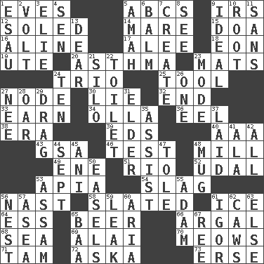 ACROSS 1. Nights before holidays 5. Lettered men learn these first 9. Big collection agency 12. Having a sole or soles 14. Female horse 15. ___ good deed 16. Place in a line 17. Toward shelter 18. Period of immesurable duration 19. Shoshoni 20. Respiratory problem 23. Floor protectors 24. Musical group of three 25. Utensil 27. Connecting point 30. Falsehood 32. Conclusion 33. Merit 34. Rounded earthenware pot or jar 36. Snakelike fish 38. Period 39. Begley and Asner 40. American Automobile Association (abbr.) 43. Girls' org. (abbr.) 46. Trial 48. Place where flour is made 49. Compass dir. 51. _ de Janeiro 52. Hereditary estate 53. Capital of Western Samoa 54. Volcanic refuse 56. Political cartoonist Thomas 58. Scheduled 61. Frozen water 64. Double-curved letter 65. Fermented drink made from hops 66. Therefore, facetiously 68. Ocean 69. Jai ____ 70. Catcalls? 71. Scottish cap 72. "____ silly question..." 73. Celtic language DOWN 1. He sold his birthright 2. Electrical Unit 3. Writer Wiesel 4. Elected rep. 5. Housemaid 6. Lip ointment 7. Cause to be 8. Observe 9. Perfect 10. Carrot, for example 11. Without 13. Letter starter 21. Grain storage tower 22. Bathroom plumbing fixture 23. Method 24. Nine, plus one 26. Single 27. Born 28. Boat paddle 29. To be drawn or hauled along 31. A person who is older than you are 35. Help 37. Put down 41. Insect wing 42. 100% 44. Back-to-school mo. 45. Black tropical American cuckoo 47. Lacquered or enameled metalware 48. Java container 50. Artist's stands 53. Indian state 55. First of billions? 56. Egg locale 57. At sea 59. Path through which fluid escapes 60. Operatic vocal solo 61. Russian composer Stravinsky 62. Crow sounds 63. Otherwise 65. Sound made by sheep 67. To riddle