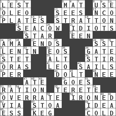 ACROSS 1. For fear that 5. Floor covering 8. Purpose 11. Butter sub 12. Perceives with the eye 13. Non-commissioned officer (abbr.) 14. Food holders 17. Ski resort town in Vermont 19. Manatee 21. Foolish or stupid persons 22. Play the lead 23. Car or cant ending 24. Housemaid (var.) 27. Extremities 29. Fast jet (abbr.) 32. Soviet premier 1918-24 34. Greek goddess of the dawn 36. Yard entry 37. Proofreading order 38. Keyboard modifier key 39. Tumult 40. Mouths or openings 41. Lion 42. Moves on water 43. For each 44. Stupid person 46. Born 47. Had dinner 50. Moves 52. Food allowance for one day 55. Cigar-shaped 57. Make much ado about nothing 59. Pressed 62. By way of 63. Portico 64. The content of cognition 65. Double-curved letter 66. Cask 67. Having a low temperature DOWN 1. Trim (branches) 2. Pipe bend 3. Oceans 4. Hauls 5. Was introduced to 6. Nest on high 7. Sadhe (variant) 8. To (old English) 9. Native of Scotland 10. Immeasurably long periods of time 12. Compass dir. 15. Ingested 16. Examine hastily 18. Metal container 20. Severe or trying experience 24. Columnist Joseph or Stewart 25. Distance measurement (Brit.) 26. Approach 28. Having a sole or soles 29. Smooth fabric 30. Vertical member of a panel or frame 31. Laconic 33. ___ a Wonderful Life 35. Moe Howard, for one 36. Girls' org. (abbr.) 42. Bull 45. Australian parrot (variant) 47. Wind 48. Cod relative 49. Maternal 51. Unemotional 52. Be footloose 53. Opinion 54. Afternoon social gatherings 55. Beverage made from leaves 56. Inside; within (prefix) 58. Coat; cloak 60. Snakelike fish 61. Male parent