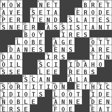ACROSS 1. Cut the grass 4. Fish or hair follower 7. Cy Young winner Saberhagen 11. "___ Maria" 12. Bristle 13. Wear away 14. For each 15. Watch over 16. Chalkboards 17. Scornful expression 19. Helper 21. Male child 23. Angers 24. Ear part 25. Grow older 26. Baseball player Mel 29. Natives or inhabitants of Denmark 30. Followers of ems 31. "We ___ not amused" (Victoria) 32. June honoree 33. Big collection agency 34. Shallow baking pan 35. Lubricate 36. _-fi 37. Potato state 40. Compass dir. 41. Area sheltered from the wind 42. Confederate soldiers (slang) 43. Examine minutely or intensely 45. Chicken ___ king 46. Conclusion 51. Moral principle 55. Foolish or stupid persons 56. Plunder 58. Binary compound 59. Having high moral qualities 60. Queen of England 1702-14 61. Lair 62. Celtic language 63. Enemy 64. Ingest DOWN 1. Atlas contents 2. Baking chamber 3. Past tense of be (plural) 4. Born 5. Inactive volcano in Sicily 6. Small amounts or degrees 7. Naughty children 8. Roll call or roster of names 9. Paradise 10. Trial 12. Disco prop 13. Otherwise 16. Titles for men of rank and authority 18. Inky black, to poets 20. Signals 22. It is so 24. Dipping utensil 25. Nest on high 26. Curses 27. Musical group of three 28. Nine, plus one 29. Raised platform 32. Two (Sp.) 33. Ancient Celtic tribe of eastern Britain 36. Narrow boards 37. Lyricist Gershwin 38. Keyboard key 39. Blind as ____ 43. Took without asking 44. Quote 46. Trig term 47. Aroma 48. Chest bones 49. Norwegian king 50. Words to Nanette 52. Flintstone garb 53. The content of cognition 54. Penny 57. Single