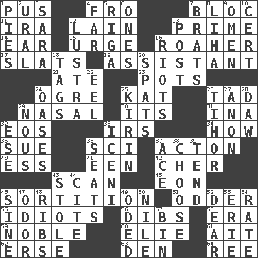 ACROSS 1. Fluid product of inflammation 4. Away 7. Group of countries in special alliance 11. Lyricist Gershwin 12. (Had) reclined 13. A-one 14. Ewer handle 15. Goad 16. Wanderer 17. Narrow boards 19. Helper 21. Had dinner 23. Cooking vessels 24. Legendary monster 25. Krazy ___ of comics 26. Bit 29. Rhinal 30. It is 31. _ tizzy (2 wds.) 32. Greek goddess of the dawn 33. Big collection agency 34. Cut the grass 35. Institute legal proceedings 36. _-fi 37. NE Massachussets city 40. Curvy letter 41. Car or cant ending 42. "Mermaids" star 43. Glance over 45. Period of immesurable duration 46. Drawing lots 51. More peculiar 55. Foolish or stupid persons 56. Claim 58. Epoch 59. Impressive in appearance 60. Writer Wiesel 61. Small island 62. Celtic language 63. Lair 64. To sift DOWN 1. Sliced desserts 2. Mountain range 3. "Two Mules for Sister ____" 4. At a great distance 5. Port city in Latvia 6. Washington bills 7. Naughty children 8. Pale green bean 9. Sign of something about to happen 10. Foregone conclusion 12. A period of five years 13. Mail 16. Debaucheries 18. Labels 20. Arguments over trivial matters 22. Snakelike fish 24. Fertile tracts in a desert 25. Japanese brewing company 26. The easternmost of the Lesser Sundas 27. At once, immediately (arch.) 28. Fool 29. Horse sense 32. Compass dir. 33. Ancient Celtic tribe of eastern Britain 36. Theater features 37. Adept person 38. Opt 39. Look after 43. Fur scarf 44. Quote 46. Trig term 47. Aroma 48. Teases 49. Wrote a lyric poem 50. Mediterranean tributary 52. Letter starter 53. 4th largest of the Great Lakes 54. Assign a rank or rating to 57. Storage container