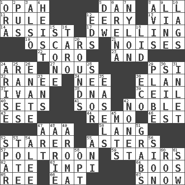 ACROSS 1. Brightly colored fish 5. Daniel's nick name 8. Everything 11. General guideline 12. Suggestive of the supernatural 13. By way of 14. Help 17. Home 19. Motion picture awards 21. Annoying sounds 22. "Corrida" creature 23. Plus 24. "We ___ not amused" (Victoria) 27. Common sense 29. 23rd letter of the Greek alphabet 32. The wife of a rajah (variant) 34. Born 36. Enthusiasm 37. "Terrible" tsar 38. Heredity factor (abbr.) 39. To provide with a ceiling 40. Arranges properly for use 41. Distress signal 42. Having high moral qualities 43. Compass dir. 44. San ____ (Riviera town) 46. Eastern Standard Time (abbr.) 47. American Automobile Association (abbr.) 50. Long (Scottish) 52. A viewer who gazes fixedly 55. Michaelmas daisies 57. Characterized by complete cowardliness 59. Flight of steps 62. Had dinner 63. Body of Kaffir warriors 64. Scornful sounds 65. To sift 66. Ingest 67. Frozen precipitation DOWN 1. Mouth or opening 2. Fluid product of inflammation 3. In addition 4. Robbery 5. Morning condensation 6. Sports stadium 7. Thermoplastic polyamide 8. Advice 9. Actor's bit 10. Straggles 12. Begley and Asner 15. Biscuitlike quick bread 16. Edible starchy tuberous root 18. Flaplike covering 20. Periods in a boxing match 24. Ascend 25. All-night dance parties 26. Related on the mother's side 28. Sir (Sp.) 29. Cadet 30. Travels by water 31. An arm off of a larger body of water 33. Followers of ems 35. Artist's stands 36. Environmental prefix 42. Music written for nine 45. Floor protectors 47. Nonscientific branch of learning 48. Nest on high 49. Odor 51. Seizes 52. Coast Guard woman 53. Lug 54. Toward shelter 55. Cuckoo 56. The Jewish people; Israel 58. Elect 60. Friend of Pooh 61. Compass dir.