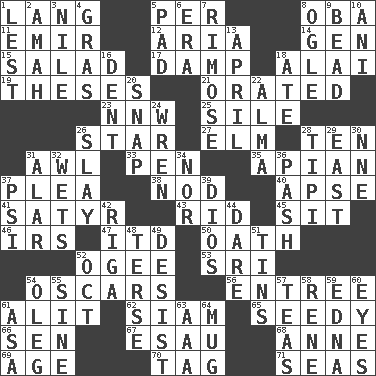 ACROSS 1. Long (Scottish) 5. For each 8. Chief or king in Benin or Nigeria 11. Arab leader 12. Roberta Peters solo 14. Commissioned mil. rank 15. Vegetable dish 17. Moist 18. Mountain range southwest of Kyrgyzstan 19. College papers 21. Spoke pompously 23. Compass dir. 25. Drop; flow; fall 26. Play the lead 27. Shade tree 28. Nine, plus one 31. Leather borer 33. Writing instrument 35. Bee-related 37. Entreaty 38. Allow head to fall sleepily 40. Domed church section 41. Letch 43. To free from 45. Be seated 46. Big collection agency 47. It would 50. Pledge 52. Double curve, resembling the letter S 53. _ Lanka 54. Motion picture awards 56. Main course 61. Set down 62. Thailand, formerly 65. Shabby and untidy 66. Elected rep. 67. He sold his birthright 68. Queen of England 1702-14 69. Ripen 70. Label 71. Oceans DOWN 1. For fear that 2. Wet nurse 3. "Death on the ____" 4. Pate de foie ____ 5. Groovy apt. 6. Period 7. Full of chinks, cracks, or crevices 8. Stare 9. Necklace unit 10. Black tropical American cuckoo 13. Showery time 16. Gouge 18. Had dinner 20. Fastener 22. _ mater 24. Songbird 26. Kill 28. Native american tent (variation) 29. 90 degrees 30. Compass dir. 31. Having or resembling wings 32. Soaks 34. Not either 36. Romantic infatuation 37. 23rd letter of the Greek alphabet 39. "Vaya con ____" 42. Capital of Latvia 44. Have the gumption 48. Laconic 49. Cease 51. Airtight sealed metal containers 52. Sep. follower 54. Cassini of fashion 55. Trig term 57. Afternoon social gatherings 58. French philosopher Descartes 59. Pulitzer Prize-winning author Ferber 60. Sight organs 61. White ___ sheet 63. American Automobile Association (abbr.) 64. Large cup