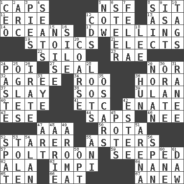 ACROSS 1. Balmoral and tarboosh 5. Overdraft (abbr.) 8. Be seated 11. One of the Great Lakes 12. ____ d'Azur (French Riviera) 13. White ___ sheet 14. Seas 17. Home 19. Unemotional ones 21. Opts 22. Grain storage tower 23. Actress Charlotte 24. Luau course 27. Lick closed 29. Not either 32. Match 34. Friend of Pooh 36. Israeli folk dance 37. Kill 38. Distress signal 39. ____ Bator 40. Wig 41. And so on (abbr.) 42. Maternal 43. Compass dir. 44. Plant excrements 46. Born 47. American Automobile Association (abbr.) 50. Roll call or roster of names 52. A viewer who gazes fixedly 55. Michaelmas daisies 57. Coward 59. Oozed 62. Insect wing 63. Body of Kaffir warriors 64. Grandmother 65. "___ Little Indians" 66. Erode 67. Afresh DOWN 1. Corporate head (abbr.) 2. Curve 3. Sliced desserts 4. Theater features 5. At this time 6. Navigate 7. Man or boy (slang) 8. Ketch in the Levant 9. Is not 10. Labels 12. Music discs 15. Annoying sound 16. Filth; sediment 18. Area sheltered from the wind 20. Unrefined 24. Thick mixture 25. Stares 26. Feeling or showing extreme anger 28. Plunders 29. Pitcher Ryan 30. Declaim 31. The wife of a rajah (variant) 33. Sight organ 35. Motion picture awards 36. Attila the _ 42. First name in cosmetics 45. Cooking vessels 47. Nonscientific branch of learning 48. Nest on high 49. Scent 51. Sports stadium 52. Argument over a trivial matter 53. Lacquered or enameled metalware 54. Actor Alda or Thicke 55. Black tropical American cuckoo 56. Connect, as a bridge 58. Elect 60. Compass dir. 61. Simpleton