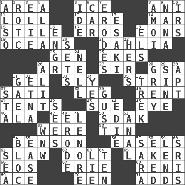 ACROSS 1. Type of rug 5. Frozen water 8. Cuckoo 11. Hang loosely or laxly 12. Have the gumption 14. Spoil 15. Vertical member of a panel or frame 17. Greek god of love 18. Immeasurably long periods of time 19. Seas 21. A pale violet or amethyst color 23. Commissioned mil. rank 25. Makes supply last 26. Johnson of "Laugh-In" 27. Title for a knight 28. Girls' org. (abbr.) 31. Set 33. Secret 35. Empty completely 37. Suttee (variant) 38. Part of a journey 40. Monthly bill 41. Portable shelters 43. Institute legal proceedings 45. Sight organ 46. Wing 47. Snakelike fish 50. Neighbor of Neb. 52. Past tense of be (plural) 53. Metal container 54. Gillaume's butler role 56. Artist's stands 61. Cole _ (cabbage dish) 62. Dunce 65. Member of a famous L.A. basketball team 66. Greek goddess of the dawn 67. 4th largest of the Great Lakes 68. Painter Guido (1575-1642) 69. Adept person 70. Car or cant ending 71. Sums up DOWN 1. In addition 2. College mil. group 3. Writer Wiesel 4. Silent film actress Nazimova 5. Binary compound 6. Automobile 7. Eats (away) 8. Mine, in Marseilles 9. Grandmother 10. Big collection agency 13. 1973 Nobel Price Winner (Physics) Leo 16. Engineer (abbr.) 18. Raised railways 20. Puts into a specified state 22. Possessive pronoun 24. 1994 drama film starring Jodie Foster 26. Set down 28. Jennifer or Joel 29. Trig term 30. Fitting 31. Highlander 32. Inactive volcano in Sicily 34. Consenting reply 36. Long journey 37. R.R. building 39. Abrupt rush of wind 42. Perceives with the eye 44. Singer Brickell 48. Wear away 49. Poe poem 51. Of or related to the anus 52. Compass dir. 54. Coalition 55. Relaxation 57. "Two Mules for Sister ____" 58. Made supply last 59. Grant temporary use of 60. Indian titles of respect 61. Ocean 63. Untruth 64. Nine, plus one
