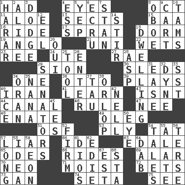 ACROSS 1. Possessed 4. Sight organs 8. Sep. follower 11. Medicinal plant 13. Religious groups 15. Sound made by sheep 16. Travel on or in a vehicle 17. Small fatty European fish 18. Dormintory (informal) 19. White American of non-Hispanic descent 21. Single; one (prefix) 22. Soaks 23. To separate or throw off 24. Shoshoni 27. Actress Charlotte 29. The Jewish people; Israel 30. Bobsleighs 34. Single 36. "Beetle Bailey" pooch 39. Romps 40. SW Asia republic 41. Memorize 43. Is not 44. Lessep's creation 46. Court order 47. Born 48. Maternal 49. Cassini of fashion 51. Order of Saint Francis (abbr.) 53. Travel a route regularly 54. Make lace 57. One who doesn't tell the truth 60. Binary compound 63. Peak District village in England 65. Lyric poems 66. Amusement-park features 69. Having or resembling wings 70. Modern: prefix 71. Wet 72. Wagers 73. Separate the seeds from cotton 74. Bristle 75. Perceive with the eye DOWN 1. Ethiopian city, capital of Harari 2. Place in a line 3. Evade 4. Double-curved letter 5. Slangy assent 6. Shade of tan 7. Comedian Laurel of Laurel & Hardy 8. Mitch Miller's instrument 9. Draw slowly or heavily 10. Scottish caps 12. Snakelike fish 14. Move through with a circular motion 18. Home 20. Fr. "Yes" 25. Implement 26. Keyboard key 28. Viper 29. Elected representatives 31. Comfort 32. Centimeter-gram-second unit of force 33. Fast jet (abbr.) 34. NW Algerian seaport 35. Nanny 37. The 19th letter of the Greek alphabet 38. Fourth or lowest deck 40. Frozen water 42. 1994 drama film starring Jodie Foster 45. French article 50. Sight organ 52. Unshakable 54. Stories 55. Having winglike extensions 56. Laconic 57. Yearn 58. The main thing one is thinking about 59. Period of immesurable duration 61. "Vaya con ____" 62. Singer Brickell 64. Pat or tap gently 67. Eastern Standard Time (abbr.) 68. R.R. building