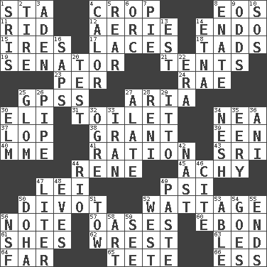 ACROSS 1. R.R. building 4. Riding implement 8. Greek goddess of the dawn 11. To free from 12. Nest on high 14. Inside; within (prefix) 15. Angers 17. Shoestrings 18. Small boys 19. Elected representative 21. Portable shelters 23. For each 24. Actress Charlotte 25. Global Positioning Systems (abbr.) 27. Operatic vocal solo 30. Connecticut Ivy Leaguer 31. Rest room 34. Teachers' org. 37. Chop off 38. Let have 39. Car or cant ending 40. Madame (abbr.) 41. Food allowance for one day 43. Indian title of respect (Mr.) 44. French philosopher Descartes 45. Painful 47. Flowery wreath 49. Air pressure measure (abbr.) 50. A piece of turf (Scot.) 52. Electrical Measurement 56. Musical sound 57. Fertile tracts in a desert 60. Inky black, to poets 61. "______ My Girl" (Turtles hit) 62. Obtain by seizing forcibly or violently 63. Directed 64. At a great distance 65. Wig 66. Double-curved letter DOWN 1. Indian titles of respect 2. Become fatigued 3. An important port of Yemen 4. Bodily heat indicating an inflammation 5. Posterior 6. The grampus (Milton) 7. Sliced dessert 8. Maternal 9. Probability 10. Mayday 13. Eastern Standard Time (abbr.) 14. Inactive volcano in Sicily 16. Plant excrements 20. Trial 22. Period 25. Seize upon or latch onto something 26. Corncob 27. Having winglike extensions 28. Painter Guido (1575-1642) 29. "Tell ____ the Marines!" 30. Shade tree 32. Legendary monster 33. SW Asia republic 34. Delicate 35. Suggestive of the supernatural 36. Black tropical American cuckoo 42. Political cartoonist Thomas 44. _ de Janeiro 46. Quote 47. 61 cubic inches 48. Nights before holidays 49. Thick mixture 50. Capital of the state of Qatar 51. Pull behind 52. 270 degrees 53. Competent 54. Travels 55. Extremities 56. Science/research agcy. 58. Tate display 59. Observe