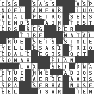 ACROSS 1. Double-curved letter 4. Backtalk 8. Cleo's killer 11. Christmas carol 13. Approach 15. Nilotic language 16. Mountain range southwest of Kyrgyzstan 17. Stone: prefix 18. Perceives with the eye 19. Is inclined (to) 21. Direct toward a target or goal 22. Trial 23. Begley and Asner 24. Cask 27. For each 29. Hoop that covers a wheel 30. Brizilian seaport 34. Regret 36. Puts into a specified state 39. Took without asking 40. Shout 41. 1973 Nobel Price Winner (Physics) Leo 43. Musical group of three 44. Peak District village in England 46. Armor plate that protects the chest 47. Sep. follower 48. Underwater navigation system 49. Flair 51. Not strict 53. Put into a specified state 54. Heredity factor (abbr.) 57. Needle holder 60. Madame (abbr.) 63. Goodbye (Sp.) 65. Old wives' tales, e.g. 66. Nest on high 69. Opinion 70. Health resort 71. Spanish missionary in California 72. Sense of smell 73. Snakelike fish 74. Russian ruler of old 75. Nine, plus one DOWN 1. Related on the mother's side 2. Having a sole or soles 3. Actors Connery and Penn 4. Plant excrement 5. One (Scot) 6. Bristle 7. Indian skirt 8. Toward shelter 9. Institutes legal proceedings 10. Mail 12. Hat (slang) 14. Frolic 18. Ski resort town in Vermont 20. What Jean-Claude Killy likes to do 25. Celtic language 26. Honkers 28. Followers of ems 29. Copy Pinocchio 31. Torque (variant) 32. Set down 33. Lion 34. Redecorate 35. Uhlan (variant) 37. Label 38. Atmospheres 40. Consenting reply 42. Small island 45. Epoch 50. _ moment's notice (2 wds.) 52. Dec. holiday 54. A piece of turf (Scot.) 55. Annoying sound 56. NE Netherlands city 57. Otherwise 58. Drink excessively 59. Mountain range 61. Confront 62. Blunders 64. One of the 12 tribes of Israel 67. Lyricist Gershwin 68. Ewer handle