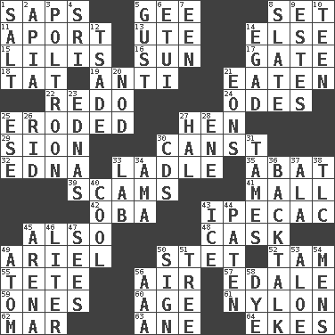 ACROSS 1. Plant excrements 5. Unit of force equal to gravity 8. Arrange properly for use 11. To the left, to Queeg 13. Shoshoni 14. Otherwise 15. Ms. Damita and namesakes 16. Player for Phoenix 17. Yard entry 18. Make lace 19. Against 21. Eroded 22. Do over again 24. Lyric poems 25. Eaten away 27. Layer 29. The Jewish people; Israel 30. 2nd pers. sing. pres. of can (arch.) 32. Pulitzer Prize-winning author Ferber 33. Dipping utensil 35. Blind as ____ 39. Fraudulent business schemes 41. Shopping center 42. Chief or king in Benin or Nigeria 43. Medicinal drug used to evoke vomiting 45. In addition 48. Keg 49. Satellite of Uranus 50. Proofreading order 52. Scottish cap 55. False hair 56. Wind 57. Peak District village in England 59. Singles 60. Personal question 61. High-strength synthetic material 62. Make imperfect 63. One (Scot) 64. Supplements with great effort DOWN 1. Table seasoning 2. Capital of Western Samoa 3. Characterized by complete cowardliness 4. Indian title of respect (Mr.) 5. Abrupt rush of wind 6. Needle holder 7. Car or cant ending 8. Chalkboard 9. _____ Park, CO 10. Adolescent 12. Sadhe (variant) 14. Mild oath 20. Dreamland 21. Immeasurably long periods of time 23. Ferber et al. 25. Compass dir. 26. To free from 27. Actor Linden 28. Compass dir. 30. Music discs 31. Makes less strong or intense 33. Experiment locale 34. Wet nurse (var.) 36. Sass 37. Chicken ___ king 38. Affectionate concern, for short 40. Calm and collected 43. Frozen water 44. Eucharist need 45. Sports stadium 46. 61 cubic inches 47. Perceives with the eye 49. Tiny particle 50. Attach a signature 51. Woody plant 53. _ vera 54. Not women's 56. Auto club (abbr.) 58. Color