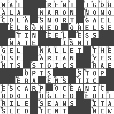 ACROSS 1. Floor protector 4. Painter Guido (1575-1642) 8. Russian composer Stravinsky 12. Chicken ___ king 13. Make _____ (do battle with) 14. Words to Nanette 15. Root beer relative 17. Derisive sound 18. Highlander 19. Turned at an angle; bent 21. Threatening words 23. Metal container 24. Snakelike fish 26. Curvy letter 27. Nathan's nickname 28. Is not 30. Set 31. Place for singles 34. Definite Article 37. Purpose 38. Believer in; advocate of (suffix) 39. Consenting reply 40. Mountains (abbr.) 41. Unemotional ones 42. Actress Charlotte 43. Elects 44. Obstruct or block passage 46. Period 47. Followers of ems 50. Nervous spasm 51. Fortification 54. Pertaining to the sea 57. Carrot, for example 58. Stared at amorously 60. Prepare for publication 62. Cause heat under the collar 63. Actors Connery and Penn 64. Call ___ day 65. Downhill vehicle 66. Portable shelter 67. ___ Haven, CT DOWN 1. Apple computer (short form) 2. _ vera 3. Baron Munchausen's specialties 4. The wife of a rajah (variant) 5. Wear away 6. And not 7. To the inside or interior of 8. Swallow 9. Scores awarded for successful feats 10. Washington bills 11. Hero or heavy, e.g. 13. Compass dir. 16. "This won't hurt ____!" 20. Single 22. Monthly bill 25. Pale purple color 27. Egg locale 29. Elected reps. 30. Chewing product 31. Electrical Unit 32. Came up 33. Cards in a Roman deck? 34. Polypeptide antibiotic 35. Pile 36. Compass dir. 41. Coast Guard woman 43. Declaimed 44. R.R. building 45. Prong on a fork 46. Learning spot: Fr. 48. Pitcher Ryan 49. Aroma 51. Blunders 52. Earth 53. Mail 55. Begley and Asner 56. Quote 59. Turn to the right 61. The 23rd letter of the Hebrew alphabet