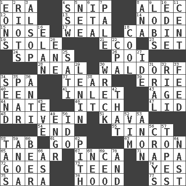ACROSS 1. Period 4. Clip 8. Actor Baldwin 12. Lubricate 13. Stalk of a moss capsule 14. Thickened enlargement 15. Olfactory organ 17. Welt 18. Apartment or room in a ship 19. Took without asking 21. Environmental prefix 23. Put into a specified state 24. Connects, as a bridge 26. Luau course 28. Anneal 30. Apple salad 34. Health resort 37. Separate forcefully 39. One of the Great Lakes 40. Car or cant ending 41. An arm off of a larger body of water 43. Ripen 44. Nathan's nickname 46. Hankering 47. Flaplike covering 48. Popular '50s hangout 51. Polynesian shrub of the pepper family 54. Conclude 55. A color or tint 58. Keyboard key 61. Republican Party 63. Person of subnormal intelligence 65. Approach 67. South American Indian 71. California wine valley 72. Moves 73. Adolescent 74. It is so 75. "Two Mules for Sister ____" 76. Parka part 77. Fast jet (abbr.) DOWN 1. Immeasurably long periods of time 2. Disturbances 3. Columnist Joseph or Stewart 4. Compass dir. 5. Born 6. Call ___ day 7. Diluted with white 8. Santa ___, CA 9. Tennis shots 10. Singer Brickell 11. Penny 16. Enthusiasm 18. Calm and collected 20. Compass dir. 22. Accounting whiz (abbr.) 25. Suttee (variant) 27. Binary compound 29. Soviet premier 1918-24 30. Raze 31. Of the mouth 32. Swiss mountan, "Queen of the Mountains" 33. Nourish 34. Post 35. Lightbulb-shaped fruit 36. Opposed to 38. Keyboard modifier key 42. Not this but _ 45. Night before a holiday 49. Engineer (abbr.) 50. Wedding promise 52. Zeal 53. At once, immediately (arch.) 56. Trading vessels 57. Drinks excessively 58. Labels 59. Small Philippine buffalo 60. Fermented drink made from hops 62. Essential or central part 64. Political cartoonist Thomas 66. White ___ sheet 68. Modern: prefix 69. Corporate head (abbr.) 70. Plus