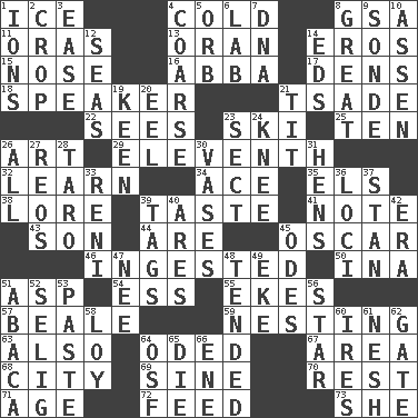 ACROSS 1. Frozen water 4. Having a low temperature 8. Girls' org. (abbr.) 11. Mouths or openings 13. Northwest Algerian city 14. Greek god of love 15. Characteristic smell of wine 16. Swedish rock group 17. Lairs 18. Orator 21. Sadhe (variant) 22. Observes 23. What Jean-Claude Killy likes to do 25. "___ Little Indians" 26. Tate display 29. Veterans Day date 32. Acquire or gain knowledge or skills 34. Adept person 35. Raised railways 38. Old wives' tales, e.g. 39. Clothes sense 41. Brief written record 43. Male offspring 44. "We ___ not amused" (Victoria) 45. Motion picture award 46. Consumed 50. _ tizzy (2 wds.) 51. Cleo's killer 54. Curvy letter 55. Supplements with great effort 57. Memphis, Tenn. Street 59. Snuggling 63. In addition 64. Wrote a lyric poem 67. Type of rug 68. Municipality 69. Trig term 70. State of inaction 71. Grow older 72. Nourish 73. A female animal or person DOWN 1. Charged atoms 2. Riding implement 3. Comfort 4. Unrefined 5. Globe 6. Experiment locale 7. Heredity factor (abbr.) 8. Relatively large 9. Something which is sent 10. NE Netherlands city 12. Oceans 14. Begley and Asner 19. Peachy ____! 20. Snakelike fish 21. Teat (slang) 23. Religious group 24. Leg joint 26. 100% 27. Vintage cars 28. Edible starchy tuberous root 30. Flower holders 31. Coop moms 33. Painter Guido (1575-1642) 36. Event scenes 37. Comedian Laurel of Laurel & Hardy 39. Labels 40. Ancient Greek god of war 42. Epoch 45. Lyric poems 47. Born 48. Looked after 49. Make supply last 51. Phillipine bananalike plant 52. Major League Baseball Commissioner Bud 53. Thick mixture 56. Play the lead 58. Myrna of the movies 60. Angers 61. Tender 62. Yard entry 64. Order of Saint Francis (abbr.) 65. Expire 66. Compass dir.