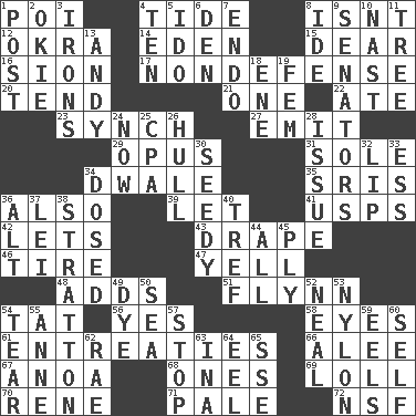 ACROSS 1. Luau course 4. Event that recurs at intervals 8. Is not 12. Gumbo ingredient 14. Locale of original sin 15. Letter starter 16. The Jewish people; Israel 17. Unrelated to defense, as in spending 20. Be inclined (to) 21. Single 22. Had dinner 23. Synchronize (abbr.) 27. Send forth 29. Musical composition 31. Not divided or shared with others 34. A sleeping potion; an opiate (poet.) 35. Indian titles of respect 36. In addition 39. Allow 41. United States Postal Service (abbr.) 42. Allows 43. Window treatment 46. Hoop that covers a wheel 47. Shout 48. Does sums 51. Film actor Errol 54. Make lace 56. Consenting reply 58. Sight organs 61. Pleas 66. Toward shelter 67. Small Philippine buffalo 68. Washington bills 69. Hang loosely or laxly 70. French philosopher Descartes 71. Light colored 72. Overdraft (abbr.) DOWN 1. Mail 2. Migrant worker of the '30s 3. Removes the wrinkles 4. "___ Little Indians" 5. Wedding promise 6. Lair 7. Inside; within (prefix) 8. Binary compound 9. Elected representatives 10. Political cartoonist Thomas 11. Relationship diagram 13. Actor Griffith 18. Compass dir. 19. Opposite of masc. 24. At this time 25. Accounting whiz (abbr.) 26. Frame or body of a ship 28. Come out of 30. Shabby and untidy 32. Mouth edge 33. Double-curved letter 34. Administered medicine 36. The first octave above the treble staff 37. Luau accessory 38. Ski resort town in Vermont 40. Not kosher 44. 100% 45. Travel a route regularly 49. Color 50. Ocean 52. Actress Patricia 53. High-strength synthetic material 54. Pull into pieces 55. Singer Murray 57. Halt 59. Snakelike fish 60. Automatic 62. Actress Charlotte 63. _ tizzy (2 wds.) 64. Snakelike fish 65. Compass dir.