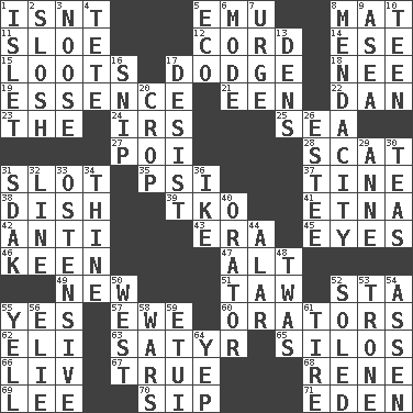 ACROSS 1. Is not 5. Australian flightless bird 8. Floor covering 11. _ gin 12. Drawstring 14. Compass dir. 15. Plunders 17. Evade 18. Born 19. Gist 21. Car or cant ending 22. Daniel's nick name 23. Definite Article 24. Big collection agency 25. Ocean 27. Luau course 28. Scram, to a cat 31. Narrow, elongated depression 35. Air pressure measure (abbr.) 37. Prong on a fork 38. Food container 39. Ring climax 41. Inactive volcano in Sicily 42. Opposed to 43. Period 45. Sight organs 46. Peachy ____! 47. Keyboard modifier key 49. ___ Haven, CT 51. The 23rd letter of the Hebrew alphabet 52. R.R. building 55. It is so 57. She-sheep 60. Speakers 62. Biblical high priest 63. Letch 65. Grain storage towers 66. 54 in ancient Rome 67. Loyal 68. French philosopher Descartes 69. Area sheltered from the wind 70. Small drink 71. Genesis locale DOWN 1. Small island 2. Splash clumsily 3. Trap for birds or small mammals 4. Wig 5. Environmental prefix 6. Method 7. Goad 8. Ananias' fault 9. At sea 10. Adolescent 13. Hiding places for outlaws 16. Clip 17. Stop 20. Riding implement 26. First name in cosmetics 29. Singer Murray 30. Beverages made from leaves 31. Neighbor of Neb. 32. Actor's bit 33. Clearly or manifestly demonstrative 34. One or ones belonging to thee 36. Mamie's mate 40. Speaker 44. Having or resembling wings 48. It was, poetically 50. Compass direction 52. Having a sole or soles 53. Marketplace scale 54. NE Netherlands city 55. Shout 56. Writer Wiesel 58. Armed conflicts 59. Needle holder 61. Hoop that covers a wheel 64. Slangy assent