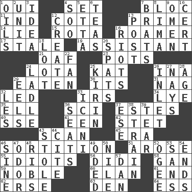 ACROSS 1. Fr. "Yes" 4. Arrange properly for use 7. Coalition 11. Indiana (abbr.) 12. ____ d'Azur (French Riviera) 13. A-one 14. Untruth 15. Round or rotation of duties 16. Wanderer 17. Showing deterioration from age 19. Helper 21. Clumsy lout 23. Plant holders 24. Globular water bottle used in Asia 25. Krazy ___ of comics 26. _ tizzy (2 wds.) 29. Eroded 30. ___ a Wonderful Life 31. Tired old horse 32. Directed 33. Big collection agency 34. Sodium hydroxide 35. Pipe bend 36. _-fi 37. _____ Park, CO 40. Compass dir. 41. Car or cant ending 42. Proofreading order 43. Skim 45. Epoch 46. Conclusion 51. Came up 55. Foolish or stupid persons 56. "You Light Up My Life" star Conn 58. Separate the seeds from cotton 59. Having high moral qualities 60. Enthusiasm 61. Conclusion 62. Celtic language 63. Lair 64. Double-curved letter DOWN 1. Petroleums 2. A single undivided whole 3. It may be bright or harebrained 4. "Barney Miller" actor Jack 5. Singer James 6. Afternoon social gatherings 7. Naughty children 8. Pale green bean 9. Sign of things to come 10. Foregone conclusion 12. Make 13. Mail 16. Disturbances 18. Plunder 20. Arguments over trivial matters 22. Avid follower 24. Dipping utensil 25. Japanese brewing company 26. An arm off of a larger body of water 27. Negative votes 28. Mature 29. Snakelike fish 32. French article 33. Ancient Celtic tribe of eastern Britain 36. Theater features 37. Compass dir. 38. Put through a sieve 39. Pull apart 43. Fur scarf 44. Quote 46. Trig term 47. Scent 48. Chest bones 49. Wrote a lyric poem 50. The longest river in the world 52. Double curve, resembling the letter S 53. Without 54. Extremities 57. Daniel's nick name