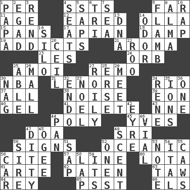 ACROSS 1. For each 4. Fast planes 8. At a great distance 11. Ripen 12. Having ears or earlike features 14. Rounded earthenware pot or jar 15. Baking dishes 17. Bee-related 18. Moist 19. Inveterate users 21. Odor 23. French article 24. Globe 25. Mine, in Marseilles 27. San ____ (Riviera town) 30. Basketball assoc. 31. Poe poem 34. River (Sp.) 37. Everything 38. Annoying sound 39. Period of immesurable duration 40. Set 41. Erase 43. Compass dir. 44. More than one (prefix) 45. Jacques Cousteau's middle name 47. ___ good deed 49. _ Lanka 50. Omens 52. Pertaining to the sea 56. Quote 57. Place in a line 60. Globular water bottle used in Asia 61. Johnson of "Laugh-In" 62. Eucharist need 63. The 23rd letter of the Hebrew alphabet 64. Marina Del _, California 65. Inconspicuous attention getter 66. Raised railways DOWN 1. Dad 2. Mild oath 3. Tear apart 4. Theater features 5. Plant excrements 6. Three (prefix) 7. Ocean 8. Flambe (short form) 9. _ mater 10. Hit sharply and swiftly 13. Heredity factor (abbr.) 14. Aroma 16. Grain storage tower 20. To provide with a ceiling 22. Friend of Pooh 25. Competent 26. Promenade 27. Agitated, as a liquid 28. Celtic language 29. Rendezvous 30. Tired old horse 32. Inside; within (prefix) 33. Christmas carol 34. French philosopher Descartes 35. Charged atoms 36. Single 42. Jane of fiction 44. Baking dish 46. Small bottle 47. Simple song 48. Double curve, resembling the letter S 49. Odor 50. The founder of a family 51. Plant excrement 52. Singles 53. Make mention of 54. Slanted text style (abbr.) 55. Crow sounds 56. Automobile 58. Pet locale 59. It is