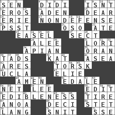 ACROSS 1. Elected rep. 4. "You Light Up My Life" star Conn 8. Is not 12. Greek god of love 14. An important port of Yemen 15. Letter starter 16. 4th largest of the Great Lakes 17. Unrelated to defense, as in spending 20. Inconspicuous attention getter 21. Bear (Spanish) 22. Had dinner 23. Artist's stand 27. Religious group 29. Toward shelter 31. Australian parrot (variant) 34. Bee-related 35. NW Algerian seaport 36. Bits 39. Krazy ___ of comics 41. Toward the sea 42. Ancient Greek god of war 43. Cod relative 46. Southern CA. univ. 47. Writer Wiesel 48. So be it 51. Peak District village in England 54. Remaining after all deductions 56. Area sheltered from the wind 58. Prepare for publication 61. The property of being fit to eat 66. Become fatigued 67. Small Philippine buffalo 68. Tenth: prefix 69. Proofreading order 70. Austrian-born American filmmaker Fritz 71. In a ____ (agitated or irritated) 72. Compass dir. DOWN 1. Ooze 2. Blunders 3. Annoying sound 4. One of the 12 tribes of Israel 5. Wedding promise 6. Lair 7. _ china 8. Binary compound 9. Elected representatives 10. Political cartoonist Thomas 11. Relationship diagram 13. Bristle 18. Double-curved letter 19. Enemy 24. Plant excrement 25. Connecticut Ivy Leaguer 26. Path through which fluid escapes 28. Cover or conceal 30. Related on the mother's side 32. Actress Charlotte 33. _ tizzy (2 wds.) 34. Indian state 36. The 19th letter of the Greek alphabet 37. Curve 38. Conveyance 40. Lacquered or enameled metalware 44. To free from 45. Ocean 49. Pipe bend 50. Born 52. Allows 53. Proofreads 54. Anneal 55. Pulitzer Prize-winning author Ferber 57. Extremities 59. Angers 60. False hair 62. Paper or plastic container 63. Car or cant ending 64. _-fi 65. Be seated