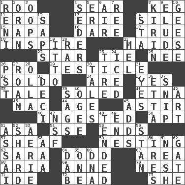 ACROSS 1. Friend of Pooh 4. Shrivel 8. Cask 11. Greek god of love 13. One of the Great Lakes 14. Drop; flow; fall 15. California wine valley 16. Have the gumption 17. Loyal 18. Heighten or intensify 21. Unmarried girls 22. Play the lead 23. Make a knot 25. Born 26. Adept person 29. A testis 32. Twentieth part of a lira 34. "We ___ not amused" (Victoria) 35. Consenting reply 38. Falsehood 39. Having a sole or soles 41. Inactive volcano in Sicily 43. Big _ 44. Ripen 45. Moving about 46. Eaten 50. Fitting 51. White ___ sheet 54. Compass dir. 55. Extremities 57. To gather and bind into a bundle 59. Inhabiting a nest 63. "Two Mules for Sister ____" 64. Texas town _ City 67. Length times width 68. Operatic vocal solo 69. Singer Murray 70. Egg locale 71. Binary compound 72. Necklace unit 73. A female animal or person DOWN 1. Painter Guido (1575-1642) 2. NW Algerian seaport 3. I made a mistake 4. Spring feasts 5. Epoch 6. Wind 7. Portuguese money of account (variant) 8. Japanese brewing company 9. Evade 10. Honkers 12. Plant excrements 14. R.R. building 19. "Tell ____ the Marines!" 20. Actress Charlotte 21. Cartoonist voice _ Blanc 23. Become fatigued 24. On the rocks 26. Pacific Standard Time (abbr.) 27. Wander aimlessly 28. Spanish pot 30. Lies 31. Sight organs 33. Tenth: prefix 36. Singer James 37. Clip 39. Sinks 40. Double curve, resembling the letter S 42. Nonscientific branch of learning 45. Does sums 47. Overdraft (abbr.) 48. Watched over 49. Compass dir. 51. Slender Brazilian palm 52. Broken piece 53. Nest on high 56. Comedian Laurel of Laurel & Hardy 58. Auto club (abbr.) 60. Angers 61. Delicate 62. Yard entry 64. Small moist lump or mass 65. Single 66. Heredity factor (abbr.)