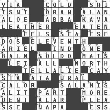 ACROSS 1. By way of 4. Chilled 8. Indian title of respect (Mr.) 11. Is not 13. Northwest Algerian city 14. Actor Alda or Thicke 15. _ vera 16. Swedish rock group 17. Polynesian shrub of the pepper family 18. Cordwainer's material 21. Ingested 22. Snakelike fish 23. Ocean 25. Compass dir. 26. Two (Sp.) 29. Veterans Day date 32. Satellite of Uranus 34. Working for oneself (abbr.) 35. Single 38. Lip ointment 39. Twentieth part of a lira 41. Floor protectors 43. Flowery wreath 44. Everything 45. _ pole 46. Copy Pinocchio 50. Island 51. R.R. building 54. _ moment's notice (2 wds.) 55. Mountain range 57. Bodily heat indicating an inflammation 59. Deli grouping 63. Set down 64. Component 67. Greater amount 68. Gouge 69. Having or resembling wings 70. Entreaty 71. Compass dir. 72. California wine valley 73. Double-curved letter DOWN 1. Small bottle 2. Small island 3. Small Philippine buffalo 4. Unrefined 5. Globe 6. Experiment locale 7. Heredity factor (abbr.) 8. Schedule 9. All-night dance parties 10. Silly 12. Wig 14. Alias (abbr.) 19. The bottom of a shoe or boot 20. Pipe bend 21. Ingest 23. Transmit 24. Inside; within (prefix) 26. Small moist lump or mass 27. Relating to the mouth 28. Drop; flow; fall 30. Country estate 31. Same (prefix) 33. Send forth 36. Drug cop 37. Singer James 39. Table seasoning 40. Rounded earthenware pot or jar 42. Like a shrinking violet 45. Be tempered by heat 47. Ewer handle 48. A period of five years 49. Retirement account (abbr.) 51. Loads 52. Falsehoods 53. Place in a line 56. Desk light 58. Baseball player Mel 60. Undercover agent 61. Angers 62. Oceans 64. Baking dish 65. In the manner of 66. Strike