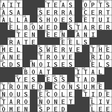 ACROSS 1. Small island 4. Afternoon social gatherings 8. Elects 12. White ___ sheet 13. Father Junipero _ 14. Foregone conclusion 15. Silent film actress Nazimova 17. Imelda's hoard 18. Needle holder 19. Shoved, as through a crowd 21. A viewer who gazes fixedly 23. Nine, plus one 24. Car or cant ending 26. Cuckoo 27. Assign a rank or rating to 28. Snakelike fish 30. Cartoonist voice _ Blanc 31. Turn aside suddenly 34. Definite Article 37. A saturated hydrocarbon 38. Collection of objects 39. To free from 40. Music discs 41. Annoying sounds 42. Raised railways 43. Water vessel 44. Slanted text style (abbr.) 46. Consenting reply 47. Double-curved letter 50. Bit 51. Pressed 54. Ingest 57. Good sense 58. Learning spot: Fr. 60. Periodic rise and fall of the sea level 62. Pacific island yam 63. Music written for nine 64. 54 in ancient Rome 65. Sign of things to come 66. Moved rapidly 67. Area sheltered from the wind DOWN 1. American Automobile Association (abbr.) 2. Small island 3. Baron Munchausen's specialties 4. Giggle 5. Wear away 6. "We ___ not amused" (Victoria) 7. Backtalk 8. Seas 9. _ dish (used to culture cells) 10. Loyal 11. Commotion 13. Compass dir. 16. Collude with 20. Single 22. Lie 25. Boldness 27. Tear apart 29. Nights before holidays 30. Big _ 31. Portico 32. Compose 33. Greek goddess of the dawn 34. Excercise machine 35. Land elevation 36. Begley and Asner 41. Characteristic smell of wine 43. Gillaume's butler role 44. ___ a Wonderful Life 45. Drawn tight 46. You are 48. Biscuitlike quick bread 49. Having a sole or soles 51. To the inside or interior of 52. Wander 53. Habitations of wild animals 55. Fish or hair follower 56. Singer Brickell 59. Police officer (slang) 61. First lady