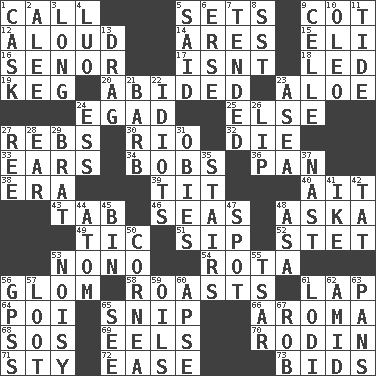 ACROSS 1. Give a ring to 5. Arranges properly for use 9. Small bed 12. Verbally 14. Ancient Greek god of war 15. Biblical high priest 16. Sir (Sp.) 17. Is not 18. Directed 19. Barrel 20. Stayed 23. Medicinal plant 24. Mild oath 25. Otherwise 27. Confederate soldiers (slang) 30. _ de Janeiro 32. Pass on 33. Hearing organs 34. Moves up and down 36. Baking dish 38. Epoch 39. Teat (slang) 40. Small island 43. Bar bill 46. Oceans 48. "____ silly question..." 49. Nervous spasm 51. Small drink 52. Proofreading order 53. Words to Nanette 54. Roll call or roster of names 56. Take by theft 58. Cooks with dry heat, as in an oven 61. Pet locale 64. Luau course 65. Sever or remove by pinching or nipping 66. Odor 68. Mayday 69. Snakelike fish 70. "The Thinker" sculptor 71. Filthy place 72. Comfort 73. Auction offers DOWN 1. Keg 2. Toward shelter 3. Protracted 4. Nilotic language 5. Expressed in words 6. Celtic language 7. Watched over 8. Fast jet (abbr.) 9. Cell (Danish) 10. Margarine 11. Periodic rise and fall of the sea level 13. To draw with force 21. Sharp remark 22. Foolish or stupid persons 23. Toward the sea 24. Curvy letter 26. Mouth edge 27. To separate or throw off 28. Hearing organ 29. Naughty child 31. Off-Broadway awards 35. Flight of steps 37. Political cartoonist Thomas 41. Mamie's husband 42. Make lace 44. Tiny particle 45. Storage container 47. Blemish 48. White ___ sheet 50. Pupil covering 53. Annoyingly loud 55. Russian ruler of old 56. Global Positioning Systems (abbr.) 57. Spoils 59. Lubricates 60. Domed church section 61. Farming town in central California 62. Among 63. Zero-star reviews 65. Perceive with the eye 67. Director Reiner
