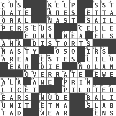 ACROSS 1. Music discs 4. Seaweed 8. Fast jet (abbr.) 11. Assign a rank or rating to 13. Ancient Greek god of war 14. Singer James 15. Of the mouth 16. Political cartoonist Thomas 17. Move on water 18. Son of Zeus who helped slay Medusa 21. Cell (Danish) 22. Pulitzer Prize-winning author Ferber 23. Teachers' org. 25. Raised railways 26. Wet nurse (var.) 29. What propaganda does 32. Offensive 34. Bear (Spanish) 35. Big collection agency 38. Type of rug 39. _____ Park, CO 41. _ and Stitch 43. Ewer handle 44. Pass on 45. Pitcher Ryan 46. Make much ado about nothing 50. She-sheep 51. According to 54. One (Scot) 55. Demure 57. It is permitted: Lat. 59. Manned the helm 63. Hearing organs 64. Naked 67. Indonesian resort city 68. A single undivided whole 69. Inactive volcano in Sicily 70. Broad, flat, thick piece 71. Bit 72. Put on (as clothing) 73. Followers of ems DOWN 1. Riding implement 2. Have the gumption 3. Play the lead 4. Sunflower state 5. Period 6. French article 7. Pacific Standard Time (abbr.) 8. Having lost freshness 9. Not moving 10. Stories 12. Otherwise 14. Compass dir. 19. Whirlpool 20. Corn or form start 21. Feline 23. Characteristic smell of wine 24. Greek god of love 26. Santa ___, CA 27. Female horse 28. At sea 30. Carrier 31. Grain storage tower 33. Edible starchy tuberous root 36. Cause heat under the collar 37. Cole _ (cabbage dish) 39. Locale of original sin 40. Father 42. Single 45. Famous astronaut Armstrong 47. Large container 48. Become visible 49. Three (prefix) 51. Native American of Southwest Alaska 52. Woody, climbing, usually tropical plant 53. Sour-tasting 56. Disorderly crowds 58. Eastern Standard Time (abbr.) 60. Lie 61. Liveliness 62. Claim 64. ___ Haven, CT 65. Shoshoni 66. Heredity factor (abbr.)