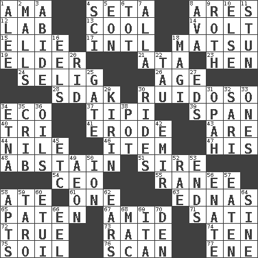 ACROSS 1. Nursemaid (var.) 4. Bristle 8. Ancient Greek god of war 12. Experiment locale 13. Calm and collected 14. Electrical Unit 15. Writer Wiesel 17. International (abbr.) 18. Taiwanese island in East China Sea 19. A person who is older than you are 21. _ moment's notice (2 wds.) 23. Layer 24. Former Milwaukee Brewers owner Bud 26. Ripen 28. Neighbor of Neb. 30. Noisy, rowdy, vocal (Spanish) 34. Environmental prefix 37. Native american tent (variation) 39. Connect, as a bridge 40. Three (prefix) 41. Eat (away) 43. "We ___ not amused" (Victoria) 44. Mediterranean tributary 46. A distinct part 47. Part of HMS, perhaps 48. Choose not to consume 51. The founder of a family 54. Corporate head (abbr.) 55. The wife of a rajah (variant) 58. Had dinner 61. Single 63. Ferber et al. 65. Eucharist need 67. Among 71. Suttee (variant) 72. Loyal 73. Pace 74. "___ Little Indians" 75. Land 76. Examine minutely or intensely 77. Compass dir. DOWN 1. Toward shelter 2. Promenades 3. Stay 4. _-fi 5. A really long time 6. Small child 7. Silent film actress Nazimova 8. Actress Gardner 9. Writer of Portnoy's Complaint (1969) 10. Otherwise 11. Surprise greatly 16. Snakelike fish 18. Wise men 20. To free from 22. The 19th letter of the Greek alphabet 25. Yard entry 27. Begley and Asner 29. Japanese brewing company 30. Amusement-park features 31. Brightly colored fish 32. Indian skirt 33. Singles 34. Inactive volcano in Sicily 35. Baby bed with high sides 36. Petroleums 38. Plant holder 42. Independent ruler or chieftain 45. And so on (abbr.) 49. Period of immesurable duration 50. Electrically charged atom 52. Actress Charlotte 53. Extremities 56. Related on the mother's side 57. Consumed 58. Tenement units (abbr.) 59. Pacific island yam 60. Needle holder 62. Hearing organs 64. Trig term 66. Snakelike fish 68. Big _ 69. Call ___ day 70. Lair