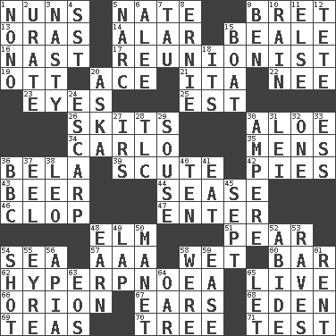 ACROSS 1. Religious women 5. Nathan's nickname 9. Cy Young winner Saberhagen 13. Mouths or openings 14. Having or resembling wings 15. Calif. Air Force Base 16. Political cartoonist Thomas 17. One who advocates reunion 19. Baseball player Mel 20. Adept person 21. Call ___ day 22. Born 23. Snake ____ (dice throw) 25. Eastern Standard Time (abbr.) 26. Burlesque acts 30. _ vera 34. Monte _, Las Vegas Hotel/Casino 35. Not women's 36. Actor Lugosi 39. Turtle shell scale 42. Sliced desserts 43. Fermented drink made from hops 44. Gospel singer Marvin 46. Hoof sound 47. Keyboard key 48. Shade tree 51. Lightbulb-shaped fruit 54. Ocean 57. Auto club (abbr.) 58. Soggy 60. Long, evenly shaped piece 62. Abnormally rapid or deep breathing 65. Not recorded 66. Greek mythologigal hunter 67. Hearing organs 68. Paradise 69. Afternoon social gatherings 70. Family _ (genealogy) 71. Trial DOWN 1. Words to Nanette 2. A salt of uric acid 3. Smutty 4. Fast jet (abbr.) 5. Drug cop 6. Toward shelter 7. The 19th letter of the Greek alphabet 8. Bert's buddy 9. Benjamin's nick name 10. Precipitation 11. Otherwise 12. False hair 15. Water vessel 18. ___ a Wonderful Life 20. "____ silly question..." 24. Fortification 27. Big collection agency 28. Affectionate concern, for short 29. Boozer 30. Electrical Unit 31. Luau accessory 32. Single 33. Curvy letter 36. English channel? 37. Snakelike fish 38. Lion 40. "___ Little Indians" 41. Ingest 45. Back-to-school mo. 48. Merit 49. Pet locale 50. French painter Edouard 52. Remain 53. All-night dance parties 54. Guess 55. Jane of fiction 56. Capital of Western Samoa 58. We are 59. Comfort 61. Monthly bill 63. Greek goddess of the dawn 64. Boat paddle 65. Allow