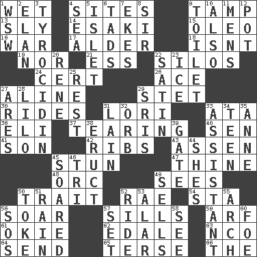 ACROSS 1. Soggy 4. Locates 9. Pack (down) 13. Roguish 14. 1973 Nobel Price Winner (Physics) Leo 15. Margarine 16. Armed conflict 17. Tree or shrub in the Birch family 18. Is not 19. Not either 21. Curvy letter 22. Grain storage towers 24. Sure thing 26. Adept person 27. Place in a line 29. Proofreading order 30. Amusement-park features 31. Australian parrot (variant) 33. _ moment's notice (2 wds.) 36. Connecticut Ivy Leaguer 37. Lacerating 40. Elected rep. 41. Manchild 42. Chest bones 43. NE Netherlands city 45. Make senseless or dizzy 47. One or ones belonging to thee 48. The grampus (Milton) 49. Observes 50. Distinguishing feature 52. Actress Charlotte 54. R.R. building 56. Fly high 57. Beverly of Met fame 59. Sandy's bark 61. Migrant worker of the '30s 62. Peak District village in England 63. Non-commissioned officer (abbr.) 64. Transmit 65. Laconic 66. Definite Article DOWN 1. Compass dir. 2. Liveliness 3. Polypeptide antibiotic 4. Ocean 5. Small island 6. Bits 7. Makes supply last 8. Title for a knight 9. Bathroom plumbing fixture 10. In addition 11. Not women's 12. Plant holder 20. French philosopher Descartes 22. Smooth fabric 23. Frozen water 25. Relief 27. Ancient Greek god of war 28. _ and Stitch 29. Indian titles of respect 31. (Had) reclined 32. Globe 33. Helper 34. Adolescent 35. Queen of England 1702-14 38. Spew [out] 39. Yard entry 44. "______ My Girl" (Turtles hit) 45. Flew 46. Three (prefix) 49. Exchanges for money 50. Puff or smoke 51. Water falling in drops from the sky 52. Travel on or in a vehicle 53. Having or resembling wings 55. Bowlike part 56. Distress signal 57. Arrange properly for use 58. Observe 60. Enemy