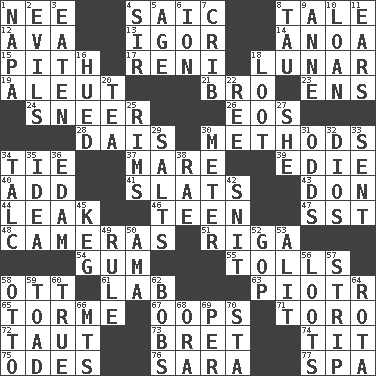 ACROSS 1. Born 4. Ketch in the Levant 8. Story 12. Actress Gardner 13. Composer Stravinsky 14. Small Philippine buffalo 15. Essential or central part 17. Painter Guido (1575-1642) 18. Type of eclipse 19. Eskimo relative 21. Sis' sibling 23. Followers of ems 24. Contemptuous expression 26. Greek goddess of the dawn 28. Raised platform 30. Modes 34. Standoff 37. Female horse 39. Singer Brickell 40. Say or write further 41. Narrow boards 43. Spanish title 44. Path through which fluid escapes 46. Adolescent 47. Fast jet (abbr.) 48. Devices for capturing images 51. Port city in Latvia 54. Chewing product 55. For Whom the Bell _____ 58. Baseball player Mel 61. Experiment locale 63. Peter (Polish) 65. Singer Mel 67. I made a mistake 71. "Corrida" creature 72. Strained 73. Cy Young winner Saberhagen 74. Teat (slang) 75. Lyric poems 76. "Two Mules for Sister ____" 77. Health resort DOWN 1. California wine valley 2. Vices 3. Consumed 4. Title for a knight 5. Mature 6. Electrically charged atom 7. Baby bed with high sides 8. The 19th letter of the Greek alphabet 9. Queen of England 1702-14 10. Grant temporary use of 11. Hearing organs 16. Took on color 18. Spoils 20. Afternoon social gathering 22. To sift 25. Basketball hoops 27. A female animal or person 29. Table seasonings 30. Distance measurement 31. Likelihood 32. "Vaya con ____" 33. Posted 34. Baby powder 35. The content of cognition 36. Dutch treat 38. Actress Charlotte 42. In a ____ (agitated or irritated) 45. Barrel 49. General guideline 50. Nanny (var.) 52. Grand Old Party 53. Set down 56. Plunders 57. Long narrow piece of something 58. Von Bismarck 59. Frog relative 60. Loyal 62. Moves up and down 64. Round or rotation of duties 66. Mountains (abbr.) 68. Mouth or opening 69. For each 70. R.R. building