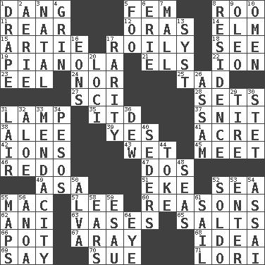 ACROSS 1. Mild oath, euphamism for damn 5. Opposite of masc. 8. Friend of Pooh 11. Hitchcock's "____ Window" 12. Mouths or openings 14. Shade tree 15. Nick name for Arthur 17. Turbulent 18. Observe 19. Player piano 21. Raised railways 22. Electrically charged atom 23. Snakelike fish 24. And not 25. Small boy 27. _-fi 28. Arranges properly for use 31. Desk light 35. It would 37. In a ____ (agitated or irritated) 38. Toward shelter 39. Consenting reply 41. Measure of real estate 42. Charged atoms 43. Dripping 45. Confront 46. Do over again 47. Two (Sp.) 49. White ___ sheet 51. Make supply last 52. Ocean 55. Big _ 57. Area sheltered from the wind 60. Thinks logically 62. Cuckoo 63. Flower holders 65. Table seasonings 66. Cooking vessel 67. Like ___ of sunshine 68. The main thing one is thinking about 69. Declare 70. Institute legal proceedings 71. Australian parrot (variant) DOWN 1. Window treatment 2. Nest on high 3. Brizilian seaport 4. Amused look 5. Egg _ yung 6. One of the Great Lakes 7. Shopping center 8. Home 9. Margarine 10. Sign of things to come 13. System (abbr.) 16. Immeasurably long periods of time 17. Noteworthy scarcity 20. Venues 26. Indian state 29. Become fatigued 30. Proofreading order 31. Den 32. Medicinal plant 33. Ananias' fault 34. Mexican monetary units 36. Morning condensation 40. Spring feasts 44. Casino tip 48. Oceans 50. Inventor's middle name 52. Twentieth part of a lira 53. Keyboard key 54. Slender Brazilian palm 55. Atlas contents 56. Small Philippine buffalo 58. Hearing organs 59. Son of Isaac 61. Move on water 64. Sight organ