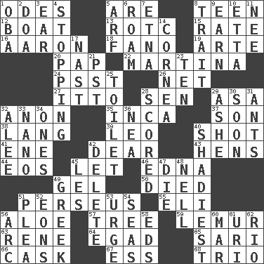 ACROSS 1. Lyric poems 5. "We ___ not amused" (Victoria) 8. Adolescent 12. Water vessel 13. College mil. group 15. Assign a rank or rating to 16. Composer Copland 18. Papal veil 19. Johnson of "Laugh-In" 20. Infant food 22. Chrissie's court nemesis 24. Inconspicuous attention getter 26. Fish or hair follower 27. "Tell ____ the Marines!" 28. Elected rep. 29. White ___ sheet 32. At once, immediately (arch.) 35. South American Indian 37. Male child 38. Long (Scottish) 39. Lion 40. Went for two points 41. Compass dir. 42. Letter starter 43. Coop moms 44. Greek goddess of the dawn 45. Allow 46. Pulitzer Prize-winning author Ferber 49. Set 50. Passed on 51. Son of Zeus who helped slay Medusa 55. Connecticut Ivy Leaguer 56. _ vera 57. Woody plant 59. Arboreal primate 63. French philosopher Descartes 64. Mild oath 65. Indian skirt 66. Keg 67. Double-curved letter 68. Musical group of three DOWN 1. Chief or king in Benin or Nigeria 2. ___ good deed 3. Hearing organ 4. Obstructing or blocking passage 5. Sandy's bark 6. Wander 7. Inactive volcano in Sicily 8. Distinguishing feature 9. Merit 10. Singer James 11. Born 14. Pupil covering 17. Political cartoonist Thomas 21. Pacific Standard Time (abbr.) 23. Nine, plus one 25. Rest room 28. Tallied 29. American tennis player Robert 30. Within a short period 31. Pismires 32. Toward shelter 33. Billionth: prefix 34. Washington bills 36. Teachers' org. 40. Most questionable 42. Keyboard key 45. French article 47. Expire 48. 1994 drama film starring Jodie Foster 49. Hellenic 51. Entreaty 52. Immeasurably long periods of time 53. Goad 54. Oceans 56. Curve 58. Begley and Asner 60. Make imperfect 61. RI univ. 62. River (Sp.)