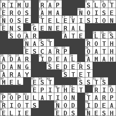 ACROSS 1. Tall New Zealand timber tree 5. Reproach for some lapse or misdeed 8. Slit 12. Greek god of love 13. Wet nurse (var.) 14. Annoying sound 15. Olfactory organ 16. Boob tube 19. Followers of ems 20. Commissioned military rank 21. Fly high 23. Had dinner 24. French article 27. Political cartoonist Thomas 30. Writer of Portnoy's Complaint (1969) 31. Fortification 34. Pledge 35. The sixth month of the Jewish calendar 38. Perfect 40. Wet nurse 41. Mild oath, euphamism for damn 42. Spring feasts 44. Like ___ of sunshine 45. Proofreading order 46. Cartoonist voice _ Blanc 47. Eastern Standard Time (abbr.) 50. Fast planes 53. Curse 57. River (Sp.) 59. Census information 63. Canvas cover 64. Debaucheries 65. Dreamland 66. The main thing one is thinking about 67. Writer Wiesel 68. Begley and Asner 69. Tender DOWN 1. French philosopher Descartes 2. Metal shackles 3. With motion or animation 4. Purpose 5. Assign a rank or rating to 6. So be it 7. Light colored 8. Distress signal 9. Cards in a Roman deck? 10. Bear (Spanish) 11. Nine, plus one 14. "Death on the ____" 17. Period 18. Large container 20. Pate de foie ____ 22. Disorder of the immune system 24. Rich soil 25. Singer James 26. Quiet! 28. _-fi 29. Small amounts or degrees 30. Exposes to great heat 32. Portuguese money of account (variant) 33. Writing tablets 35. First of billions? 36. Have the gumption 37. Of or related to the anus 39. Allow 43. Respite 47. Snakelike fish 48. Health resort 49. Teat (slang) 51. Swap 52. Founders of families 54. Prong on a fork 55. Parka part 56. Conclusions 58. Brightly colored fish 59. Before (prefix) 60. Petroleum 61. Luau course 62. Shoshoni 63. Shallow baking pan