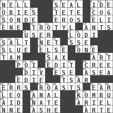 ACROSS 1. 1994 drama film starring Jodie Foster 5. Lick closed 9. Binary compound 12. Off-Broadway awards 14. Wig 15. Gear tooth 16. Message 17. Greek god of love 18. Connecticut Ivy Leaguer 19. Compass dir. 20. Trinitrotoluene 23. Pismires 24. One who makes use of a thing 25. Farming town in central California 27. Table seasoning 30. Remaining after all deductions 32. Compass dir. 33. Change direction abruptly 34. Otherwise 36. Single 38. Scottish cap 39. Saxophone 40. Nonscientific branch of learning 43. Luau course 46. Prepare for publication 48. Algonquian 49. HTML Container Element 51. Compass dir. 52. Toward the sea 53. Singer Brickell 54. Russian ruler of old 56. Blunders 58. Cooks with dry heat, as in an oven 61. Ewer handle 64. Lion 65. Of or related to the anus 66. Dried seaweed eaten as food 68. Help 69. Nathan's nickname 70. Satellite of Uranus 71. Compass dir. 72. American tennis player Robert 73. Johnson of "Laugh-In" DOWN 1. Olfactory organ 2. Inky black, to poets 3. Actor's bit 4. Directed 5. Proofreading order 6. Suggestive of the supernatural 7. Ringlike coral islands and reefs 8. French article 9. Ancient Celtic tribe of eastern Britain 10. Dunce 11. Armor plate that protects the chest 13. Arranges properly for use 21. French philosopher Descartes 22. Threatening words 23. Arabian gulf 24. Shoshoni 26. Bear (Spanish) 27. Fast jet (abbr.) 28. Wing 29. Mass 31. Sadhe (variant) 35. Is 37. Hearing organs 41. Portuguese money of account (variant) 42. Afternoon social gathering 44. Probability 45. One more than two 47. Trial 48. Automobile 50. Actresses Bloom and Felton 53. Eat (away) 55. "____ silly question..." 56. Style 57. It's straight from the horse's mouth 59. Pledge 60. Toward shelter 61. Arab leader 62. Collude with 63. Court order 65. Santa ___, CA 67. Mouth or opening