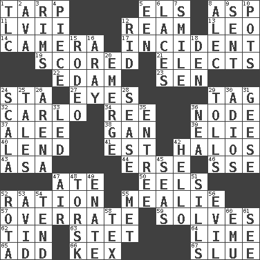 ACROSS 1. Canvas cover 5. Raised railways 8. Viper 11. 57 in ancient Rome 12. 480, 500 or 516 sheets of paper 13. Lion 14. Device for capturing images 17. Event 19. Tallied 21. Opts 22. Dutch treat 23. Elected rep. 24. R.R. building 27. Sight organs 29. Label 32. Monte _, Las Vegas Hotel/Casino 34. To separate or throw off 36. Thickened enlargement 37. Toward shelter 38. Separate the seeds from cotton 39. Writer Wiesel 40. Grant temporary use of 41. Eastern Standard Time (abbr.) 42. Saint headwear 43. White ___ sheet 44. Celtic language 46. Compass dir. 47. Had dinner 50. Snakelike fish 52. Food allowance for one day 55. Ear of corn 57. Make much ado about nothing 59. Finds the solution 62. Metal container 63. Proofreading order 64. Citrus frut 65. Increase 66. A weed 67. Turn sharply DOWN 1. Affectionate concern, for short 2. Actress Gardner 3. Basketball hoops 4. Component 5. Car or cant ending 6. Shoestrings 7. Grin 8. Actor Baldwin 9. Transmitted 10. Cooking vessels 12. To free from 15. Cowboy competition 16. Like ___ of sunshine 18. Lair 20. Develop 24. Any of the three canals of the cochlea 25. Stories 26. Sports stadium 28. Gospel singer Marvin 29. For Whom the Bell _____ 30. Goodbye (Sp.) 31. Honkers 33. Directed 35. Main course 36. Teachers' org. 42. Phone greeting 45. Oceans 47. Atmosphere 48. Cod relative 49. Maternal 51. Beverly of Met fame 52. Round or rotation of duties 53. Enthusiastic 54. Be inclined (to) 55. Was introduced to 56. Morally bad or wrong 58. John Ritter's dad 60. Australian flightless bird 61. Perceive with the eye