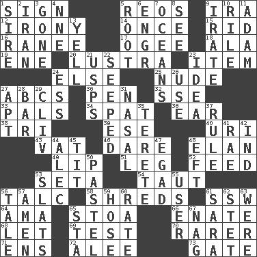ACROSS 1. Signal 5. Vintage cars 9. Lyricist Gershwin 12. Literary sarcasm 14. At one time in the past 15. To free from 16. The wife of a rajah (variant) 17. Double curve, resembling the letter S 18. Insect wing 19. Compass dir. 20. A period of five years 23. Detail 24. Otherwise 25. Unadorned 27. Lettered men learn these first 30. Fenced enclosure 32. Compass dir. 33. Friends 34. Petty quarrel 36. Ewer handle 38. Three (prefix) 39. Compass dir. 40. RI univ. 43. Large container 46. Have the gumption 48. Flair 49. Mouth edge 51. Part of a journey 52. Nourish 53. Bristle 54. Tense 56. Baby powder 58. Tears up 61. Compass dir. 64. Nanny (var.) 65. Portico 66. Maternal 68. Allow 69. Trial 70. More uncommon 71. Followers of ems 72. Toward shelter 73. Yard entry DOWN 1. The founder of a family 2. SW Asia republic 3. Went 4. Compass dir. 5. Carrot, for example 6. Engineer (abbr.) 7. Seas 8. Observe 9. Feeling or showing extreme anger 10. Cause heat under the collar 11. First man 13. Shout 21. United States Postal Service (abbr.) 22. Oozed 23. It may be bright or harebrained 24. Curvy letter 26. Purpose 27. Fitting 28. Tavern 29. 154 in Roman numerals 31. Rhinal 35. Cigar-shaped 37. Governing power 41. Actress Charlotte 42. Indiana (abbr.) 44. Actor Baldwin 45. Teat (slang) 47. Mild oath 48. Bank Draft (abbr.) 50. Soft color 53. Narrow boards 55. One who makes use of a thing 56. Story 57. So be it 59. Stockings 60. Assign a rank or rating to 61. "Two Mules for Sister ____" 62. Proofreading order 63. We are 65. R.R. building 67. Tired old horse