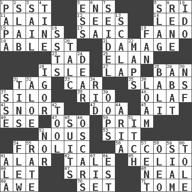 ACROSS 1. Inconspicuous attention getter 5. Followers of ems 8. _ Lanka 11. Mountain range southwest of Kyrgyzstan 12. Perceives with the eye 14. Directed 15. Aches 17. Ketch in the Levant 18. Papal veil 19. Most capable 21. Break 23. Bit 25. Enthusiasm 26. Small island 27. Pet locale 28. Bar 31. Label 33. Automobile 35. Broad, flat, thick pieces 37. Grain storage tower 38. _ de Janeiro 40. Norwegian king 41. Derisive sound 43. ___ good deed 45. Small island 46. Compass dir. 47. Bear (Spanish) 50. Demure 52. Common sense 53. Be seated 54. Play 56. Buttonhole 61. Having or resembling wings 62. Lie 65. Sun: prefix 66. Allow 67. Indian titles of respect 68. Be tempered by heat 69. Deep reverence 70. Arrange properly for use 71. Heavy book DOWN 1. Dad 2. Broad, flat, thick piece 3. Move on water 4. Prong on a fork 5. Curvy letter 6. Teachers' org. 7. Beer mug 8. Volcanic refuse 9. French philosopher Descartes 10. Wedding promise 13. Any of the three canals of the cochlea 16. Fast planes 18. Air blower 20. Baby powder 22. Atlas contents 24. Letter starter 26. Russian composer Stravinsky 28. Indonesian resort city 29. Blind as ____ 30. Science/research agcy. 31. Canisters 32. Medicinal plant 34. To free from 36. Rich soil 37. Compass dir. 39. I made a mistake 42. Utensil 44. Operatic vocal solo 48. Sets of matching outer garments 49. Motion picture awards 51. Hankering 52. And not 54. Soared 55. Pace 57. Penny 58. Margarine 59. Thailand, formerly 60. Lacquered or enameled metalware 61. Wing 63. Whopper 64. Eastern Standard Time (abbr.)