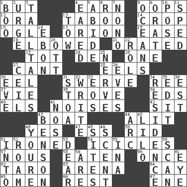 ACROSS 1. With the exception that 4. Merit 8. I made a mistake 12. Mouth or opening 13. Off limits 14. Riding implement 15. Stare at amorously 17. Constellation of myth 18. Relaxation 19. Turned at an angle; bent 21. Declaimed 23. Small child 24. Lair 26. Single 27. Patter 28. Snakelike fish 30. Snakelike fish 31. Turn aside suddenly 34. To riddle 37. Compete 38. Collection of objects 39. Begley and Asner 40. Raised railways 41. Annoying sounds 42. Be seated 43. Water vessel 44. Came down and settled, as after flight 46. It is so 47. Double-curved letter 50. To free from 51. Pressed 54. Winter's stalactites 57. Good sense 58. Consumed 60. Single time 62. Edible starchy tuberous root 63. Sports stadium 64. Island 65. Sign of something about to happen 66. Respite 67. Compass dir. DOWN 1. Surprise greeting 2. Goad 3. Baron Munchausen's specialties 4. Having ears or earlike features 5. Remain 6. Friend of Pooh 7. Words to Nanette 8. Seas 9. Declaim 10. Introduce or present, as a question 11. Broke a traffic law 13. Pull behind 16. Inky black, to poets 20. Baseball player Mel 22. Hero or heavy, e.g. 25. Impudent aggressiveness 27. To provide with a ceiling 29. Nights before holidays 30. First lady 31. Portico 32. Compose 33. Greek goddess of the dawn 34. Home 35. Prepare for publication 36. Eastern Standard Time (abbr.) 41. Characteristic smell of wine 43. Gillaume's butler role 44. Curve 45. _ and Stitch 46. You are 48. Settings 49. Aroma 51. To the inside or interior of 52. Wander aimlessly 53. Letter starter 55. _ tizzy (2 wds.) 56. Skim 59. "We ___ not amused" (Victoria) 61. Sight organ