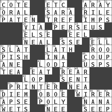 ACROSS 1. ____ d'Azur (French Riviera) 5. And so on (abbr.) 8. Like ___ of sunshine 12. Spoken 13. "Two Mules for Sister ____" 15. Cause heat under the collar 16. Eucharist need 18. Not kosher 19. Naughty children 20. By way of 22. Son of Zeus who helped slay Medusa 24. Otherwise 26. Snakelike fish 27. Actress Patricia 28. Compass dir. 29. Pipe bend 32. Narrow board 35. Thin strip of wood or metal 37. Friend of Pooh 38. Expression of disdain 39. _ tizzy (2 wds.) 40. Overturn; upset 41. One (Scot) 42. Farming town in central California 43. United States Postal Service (abbr.) 44. Beverage made from leaves 45. Erode 46. Tail end 49. Trim (branches) 50. Transmitted 51. Hard copy producer 55. Teachers' org. 56. South Vietnam president (1954) 57. Mitch Miller's instrument 59. One who wires 63. Domed church section 64. Much (prefix) 65. Nanny 66. Moistens 67. Born 68. Ooze DOWN 1. Police officer (slang) 2. Mouth or opening 3. Make lace 4. Veterans Day date 5. Eastern Standard Time (abbr.) 6. Canvas cover 7. Algonquian 8. Satellite of Uranus 9. Tall New Zealand timber tree 10. High mountains 11. Consenting reply 14. Anew 17. "Death on the ____" 21. White ___ sheet 23. Perceive with the eye 25. American author Paul (1891-1958) 28. Flight of steps 29. Greek god of love 30. Central Nebraska county 31. Chops off 32. Petty quarrel 33. Actor's bit 34. At sea 36. Also 40. Window treatments 42. Portable computer 45. Period of immesurable duration 47. Car or cant ending 48. Afresh 49. Citrus fruits 51. Corncob 52. Respite 53. Inky black, to poets 54. Hero or heavy, e.g. 56. Obsolete 58. Sight organ 60. Actress Charlotte 61. Compass dir. 62. Reproach for some lapse or misdeed