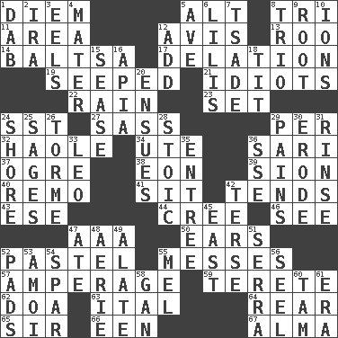 ACROSS 1. South Vietnam president (1954) 5. Keyboard modifier key 8. Three (prefix) 11. Length times width 12. Advice 13. Friend of Pooh 14. Greek mezzo-soprano Agnes 17. Conveyance 19. Oozed 21. Foolish or stupid persons 22. Water falling in drops from the sky 23. Arrange properly for use 24. Fast jet (abbr.) 27. Backtalk 29. For each 32. White Person, in Hawaii 34. Shoshoni 36. Indian skirt 37. Legendary monster 38. Period of immesurable duration 39. The Jewish people; Israel 40. San ____ (Riviera town) 41. Be seated 42. Looks after 43. Compass dir. 44. Algonquian 46. Perceive with the eye 47. Auto club (abbr.) 50. Hearing organs 52. Soft color 55. Makes clutter 57. Electrical Measurement 59. Cigar-shaped 62. ___ good deed 63. Slanted text style (abbr.) 64. Bring up, as a child 65. Title for a knight 66. Car or cant ending 67. _ mater DOWN 1. Pat or tap gently 2. Retirement account (abbr.) 3. Snakelike fish 4. Mother 5. "___ Maria" 6. Ms. Damita and namesakes 7. Sadhe (variant) 8. Musical group of three 9. Carrot, for example 10. Charged atoms 12. Say or write further 15. Gospel singer Marvin 16. Capital of Western Samoa 18. Teat (slang) 20. Takes place subsequently 24. Dinah or Pauly 25. Gurus 26. Singer Mel 28. Unemotional 29. Aches 30. Eat (away) 31. Remove soap 33. Lion 35. Main course 36. Compass dir. 42. Laconic 45. Compass direction 47. Had dinner 48. Nest on high 49. Having winglike extensions 51. Father Junipero _ 52. Writing tablets 53. Mine, in Marseilles 54. Practice fight 55. Cartoonist voice _ Blanc 56. Stitch closed the eyes of (a falcon) 58. Separate the seeds from cotton 60. Scottish cap 61. Period